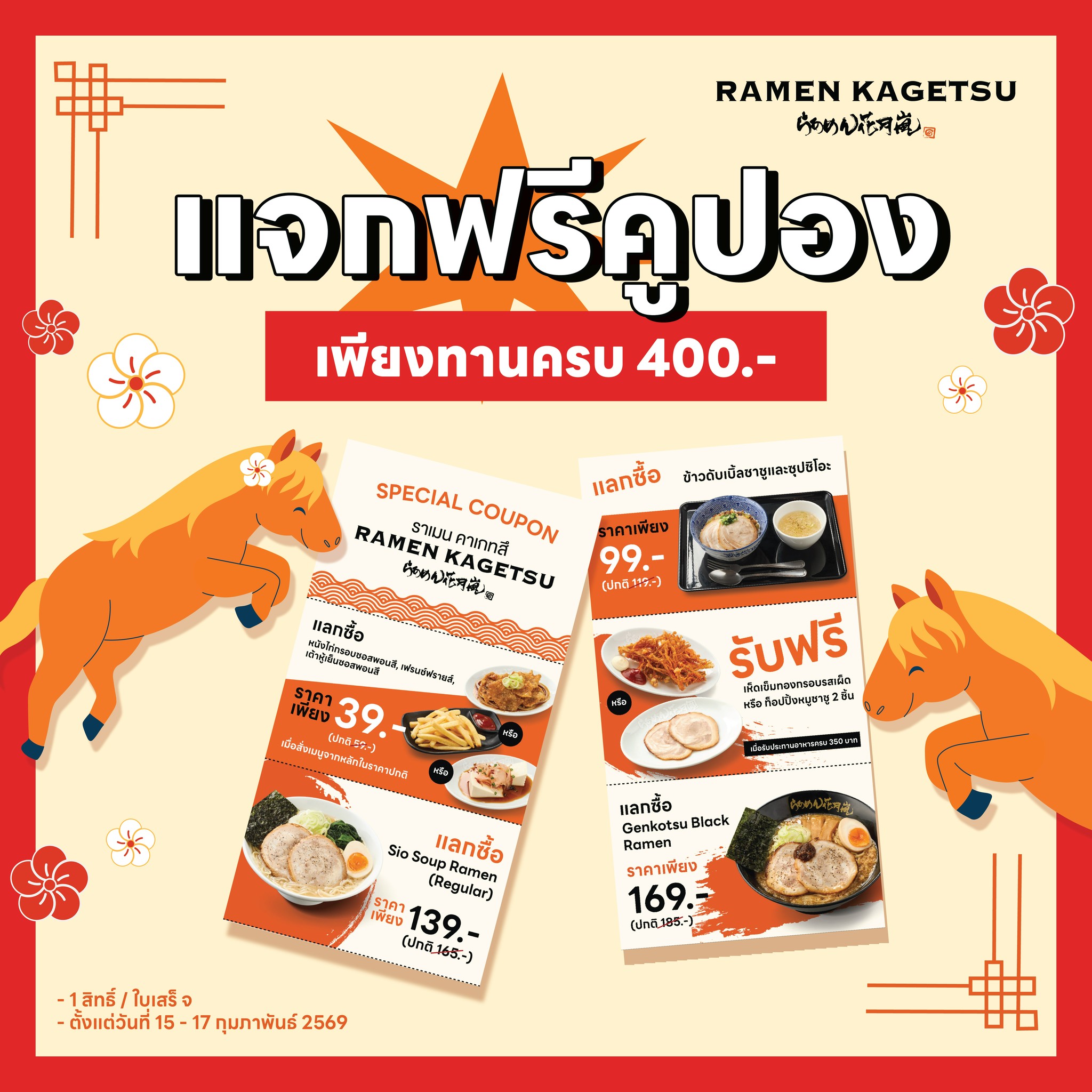 ราเมน คาเก็ตสึ อาราชิ (Ramen Kagetsu Arashi) ขอรับเทศกาลตรุษจีนนี้ ต้องเฮงตั้งแต่คำแรก แค่ทานอาหารในร้านครบ 400 บาท แลกรับคูปองพิเศษทันที อร่อย คุ้ม เฮงครบจบ กลับมาอร่อยต่อได้แบบคุ้ม ๆ อีกมื้อในร้านเดียวตั้งแต่วันนี้ ถึง 17 กุมภาพันธ์ 2569 ที่ร้านราเมน คาเก็ตสึ อาราชิทุกสาขา