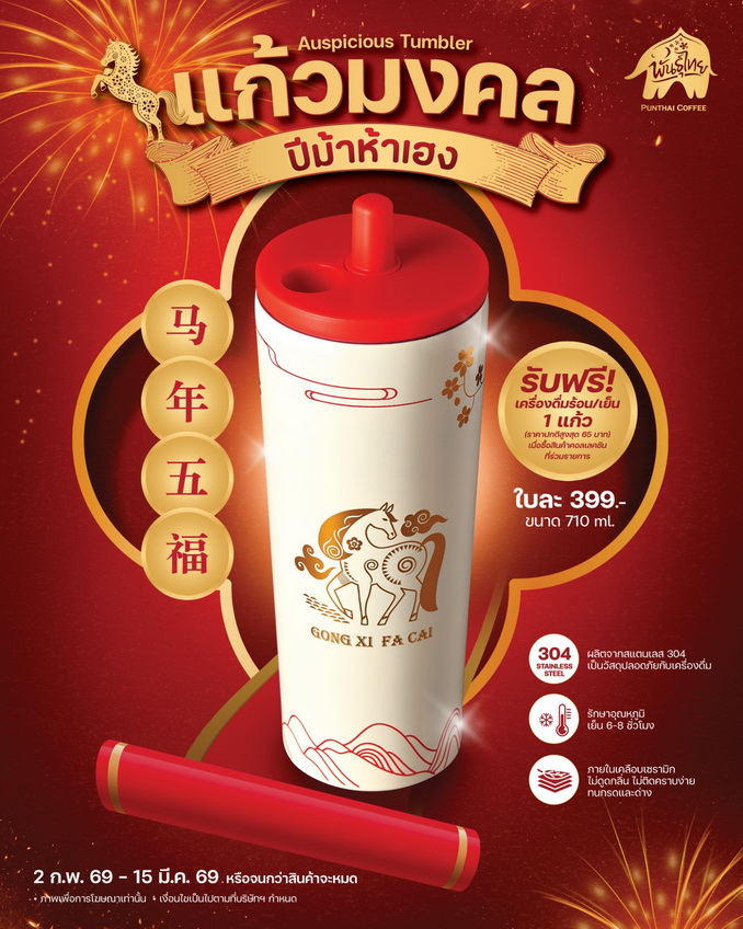 แน่นอนว่า แก้วพรีเมียมคอลเลคชันพิเศษต้องมา พลาดไม่กับ “แก้วมงคล ปีม้าห้าเฮง” แก้วทัมเบลอร์ดีไซน์สวยลายม้าสีทองติดแกลม ขนาด 710 มล. ผลิตจากวัสดุ Food Grade สแตนเลส 304 ภายในเคลือบเซรามิก เก็บอุณหภูมิได้ 6 - 8 ชั่วโมง ในราคาเพียง 399 บาท รับฟรี! เครื่องดื่มร้อนหรือเย็น 1 แก้ว ราคาปกติสูงสุด 65 บาท ตั้งแต่วันที่ 2 ก.พ. 69 – 15 มี.ค. 69 หรือจนกว่าสินค้าจะหมด ที่ร้านกาแฟพันธุ์ไทยทุกสาขาทั่วประเทศ ยกเว้นสาขาสนามบิน