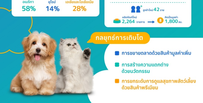แนวโน้มการเติบโตของธุรกิจยังได้รับแรงหนุนเพิ่มเติมจากผลิตภัณฑ์อาหารสัตว์ที่ขับเคลื่อนด้วยนวัตกรรม สินค้าใหม่ๆ และโภชนาการเพื่อสุขภาพ โดยยอดขายจากการเปิดตัวผลิตภัณฑ์ใหม่ในปี 2568 อยู่ที่ราว 1,800 ล้านบาท สัดส่วนสินค้าพรีเมียมยังอยู่ในช่วงบนของกรอบเป้าหมายที่ 47–50% จากการเติบโตโดดเด่นของกลุ่มขนมสัตว์เลี้ยงที่เพิ่มขึ้น 36.5% เมื่อเทียบกับปีก่อน โดยปัจจุบันกลุ่มขนมสัตว์เลี้ยงคิดเป็น 16% ของยอดขายอาหารสัตว์เลี้ยงทั้งหมด สะท้อนความต้องการของผลิตภัณฑ์กลุ่มพรีเมียมและผลิตภัณฑ์เพื่อการดูแลสุขภาพเฉพาะด้าน (Functional Products) ที่เติบโตทั่วโลก