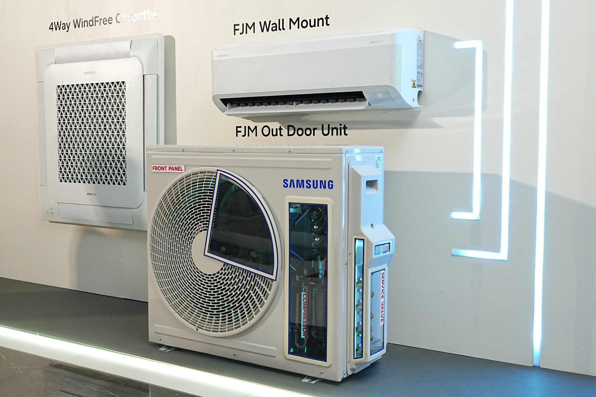 Free Joint Multi (FJM) ซึ่งเป็นชุด Condensing ที่จะเชื่อมต่อกับเครื่องปรับอากาศภายในห้องได้หลากหลายรูปแบบสูงสุด 5 ตัว ช่วยให้การออกแบบระบบปรับอากาศภายในบ้านมีความยืดหยุ่นมากขึ้น โดยรองรับการเชื่อมต่อกับเครื่องปรับอากาศแบบติดผนัง (Wall Type) และเครื่องปรับอากาศแบบฝังฝ้า (Cassette Type) และมี Infinite 1Way WindFree Cassette รุ่นใหม่ ดีไซน์เรียบหรู พร้อมระบบไฟซ่อน (indirect light) 3 ระดับ Cool , Day, Warm เพื่อปรับให้เข้ากับอารมณ์และบรรยากาศตามต้องการ ตอบโจทย์ที่อยู่อาศัยทุกรูปแบบอาทิ บ้านเดี่ยว ทาวน์โฮม โฮมออฟฟิศ และคอนโดที่มีห้องขนาดใหญ่แต่มีข้อจำกัดในการติดตั้งคอยล์ร้อน