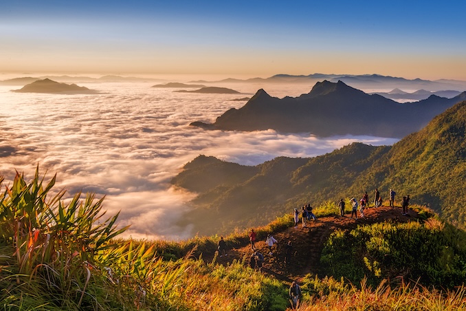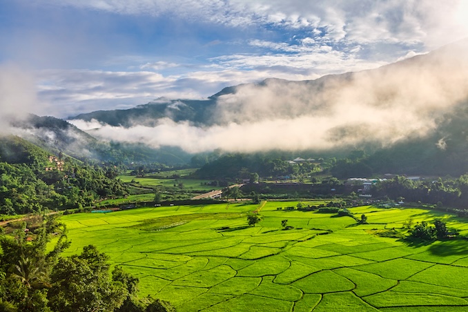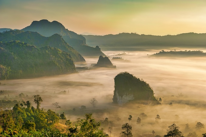 ต่อด้วย ทุ่งนาสะปัน จังหวัดน่าน ท้องนาเขียวขจีโอบล้อมด้วยขุนเขาและหมอกยามเช้า สร้างบรรยากาศสงบผ่อนคลายเหมือนอยู่กลางฝัน ดื่มด่ำกับเสน่ห์ที่แตกต่างกันทั้งในช่วงเขียวชอุ่มของฤดูฝนและทะเลหมอกในช่วงปลายฝนต้นหนาว ภูลังกา จังหวัดพะเยา คือจุดหมายที่ไม่ควรพลาด ด้วยทัศนียภาพอันเลอค่าของทะเลหมอกและผืนป่าบนยอดเขาสูง ท่ามกลางละอองขาวที่โอบล้อมราวกับหลุดเข้าไปในโลกแห่งจินตนาการ ช่วยให้จิตใจได้รับความผ่อนคลายและกลับมามีชีวิตชีวาอีกครั้ง