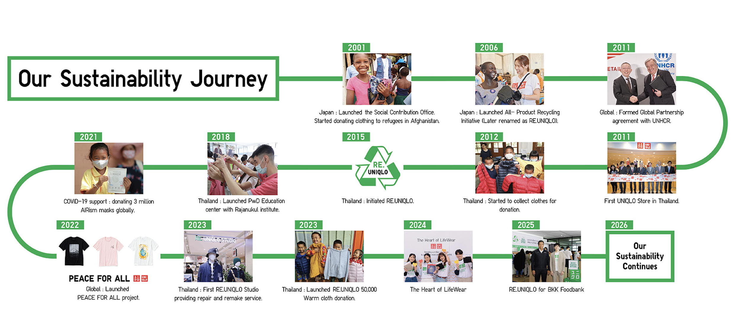 ปัจจุบัน ยูนิโคล่ ดำเนินธุรกิจในประเทศไทยเข้าสู่ปีที่ 15 และยังคงมุ่งมั่นเดินหน้าสานต่อโครงการและกิจกรรมด้านความยั่งยืนอย่างต่อเนื่อง นอกเหนือจากแคมเปญต่างๆ ที่กล่าวถึงข้างต้น ยูนิโคล่ยังดำเนินกิจกรรมด้านความยั่งยืนตลอดทั้งปี ด้วยความตระหนักถึงประเด็นด้านสิ่งแวดล้อม พร้อมสนับสนุนสังคมไทยและคนรุ่นใหม่ อาทิ การบริจาคเสื้อผ้าให้แก่ผู้ที่ขาดแคลนตลอดทั้งปี การสร้างโอกาสการจ้างงานให้แก่ผู้พิการ โครงการพัฒนาเยาวชนผ่านกีฬา รวมถึงกิจกรรมอื่นๆ อีกมากมายอย่างต่อเนื่อง