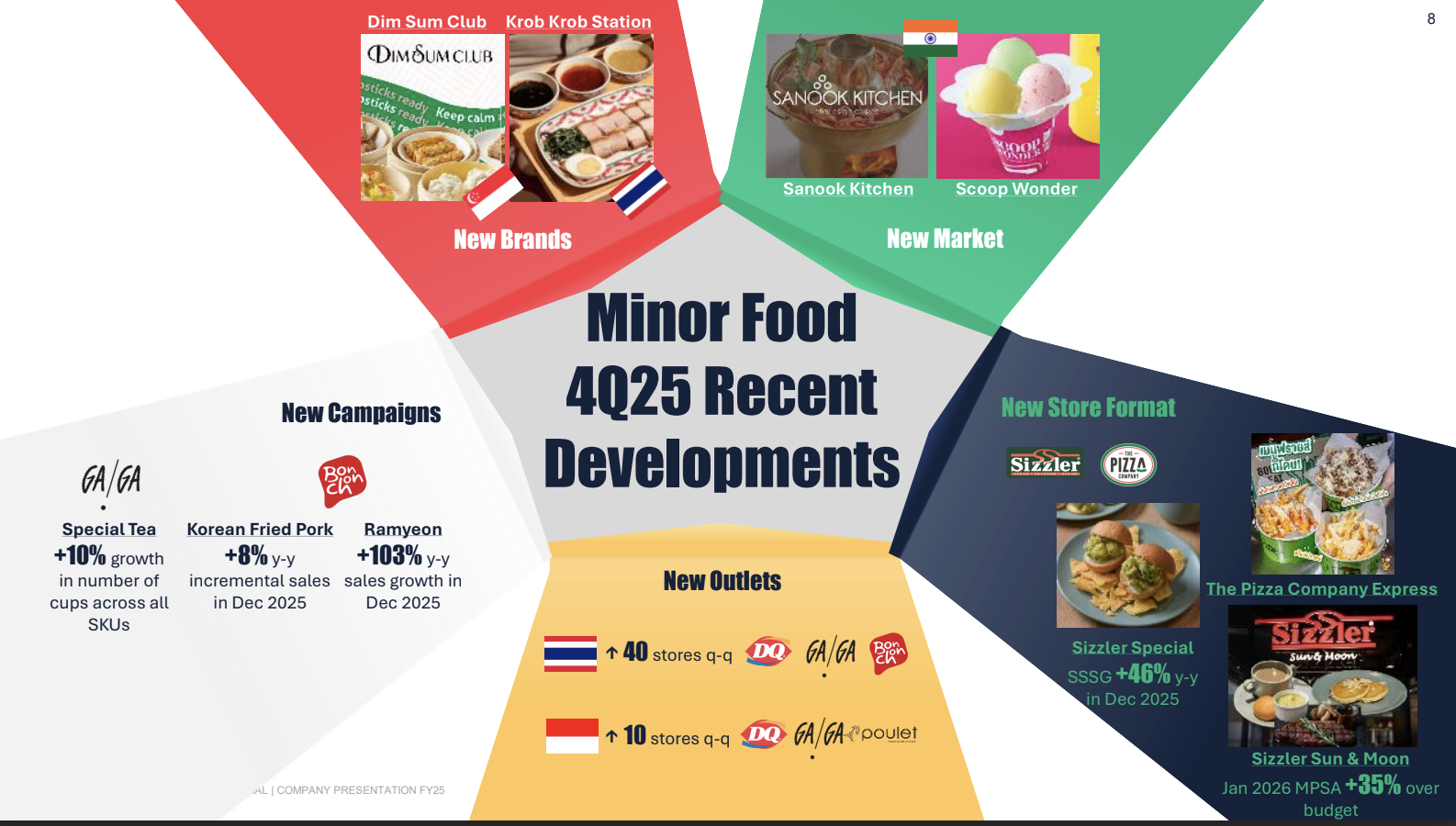 ในส่วนของธุรกิจอาหาร กำไรสุทธิตามงบการเงินปี 2568 พุ่งสูงถึง 19% โดยเน้นการขยายตัวผ่านระบบแฟรนไชส์และนวัตกรรมสินค้า: