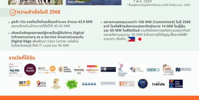 นอกจากนี้ บริษัทฯ ประกาศจ่ายเงินปันผลในอัตรา 0.412 บาทต่อหุ้น สำหรับผลการดำเนินงานปี 2568 ประกอบด้วยเงินปันผลระหว่างกาลในอัตราหุ้นละ 0.18 บาท สำหรับผลการดำเนินงานครึ่งปีแรกของปี 2568 ซึ่งจ่ายแล้วเมื่อวันที่ 10 กันยายน 2568 และเงินปันผลจ่ายงวดสุดท้ายในอัตราหุ้นละ 0.232 บาท โดยกำหนดจ่ายเงินปันผลในวันที่ 7 พฤษภาคม 2569 สอดคล้องกับนโยบายการจ่ายเงินปันผลในอัตราไม่น้อยกว่า 50% ของกำไรสุทธิจากการดำเนินงาน