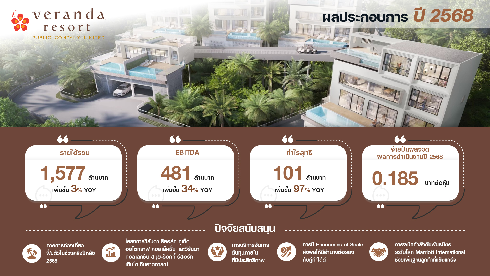 ‘บมจ.วีรันดา รีสอร์ท’ หรือ VRANDA ผู้นำธุรกิจดีไซน์โฮเทลและไลฟ์สไตล์ ประกาศความสำเร็จปี 2568 ทำรายได้รวม 1,577 ล้านบาท เติบโตต่อเนื่อง คว้ากำไรสุทธิ 101 ล้านบาท พุ่งขึ้นเกือบเท่าตัวจากปีก่อน เตรียมจ่ายเงินปันผล 0.185 บาทต่อหุ้น ในวันที่ 6 พ.ค. 2569 เผยทิศทางตลาดปี 69 สดใส การท่องเที่ยวฟื้นตัวชัดเจน จากรายได้เฉลี่ยต่อห้องพัก (RevPAR) เดือนมกราคม เติบโต 18% กางแผนรุกนักท่องเที่ยวทั่วโลก ชูโครงการ ‘ภูเก็ต-สมุย’ และเตรียมรับรู้รายได้จาก Backlog โครงการวิลล่าหรูในภูเก็ต