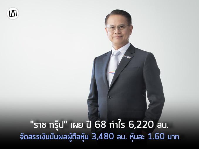 บริษัท ราช กรุ๊ป จำกัด (มหาชน) ประกาศผลการดำเนินงานงวดปี 2568 มีกำไรสุทธิ จำนวน 6,220 ล้านบาท และกำไรจากการดำเนินงานก่อนหักดอกเบี้ยทางการเงิน ภาษีเงินได้ ค่าเสื่อมราคา และค่าตัดจำหน่าย (EBITDA) เป็นจำนวน 15,322 ล้านบาท การนี้ ที่ประชุมคณะกรรมการบริษัทฯ ครั้งที่ 2/2569 เมื่อวันที่ 26 กุมภาพันธ์ 2569 มีมติอนุมัติเงินปันผลประจำปี 2568 สำหรับผู้ถือหุ้น เป็นเงินจำนวน 3,480 ล้านบาท (หุ้นละ 1.60 บาท) คิดเป็นร้อยละ 55.94 ของกำไรปี 2568 โดยจะนำเสนอที่ประชุมสามัญผู้ถือหุ้นเพื่อขออนุมัติในวันที่ 23 เมษายน 2569 และคาดว่าจะสามารถจ่ายเงินปันผลได้ในวันที่ 22 พฤษภาคม 2569