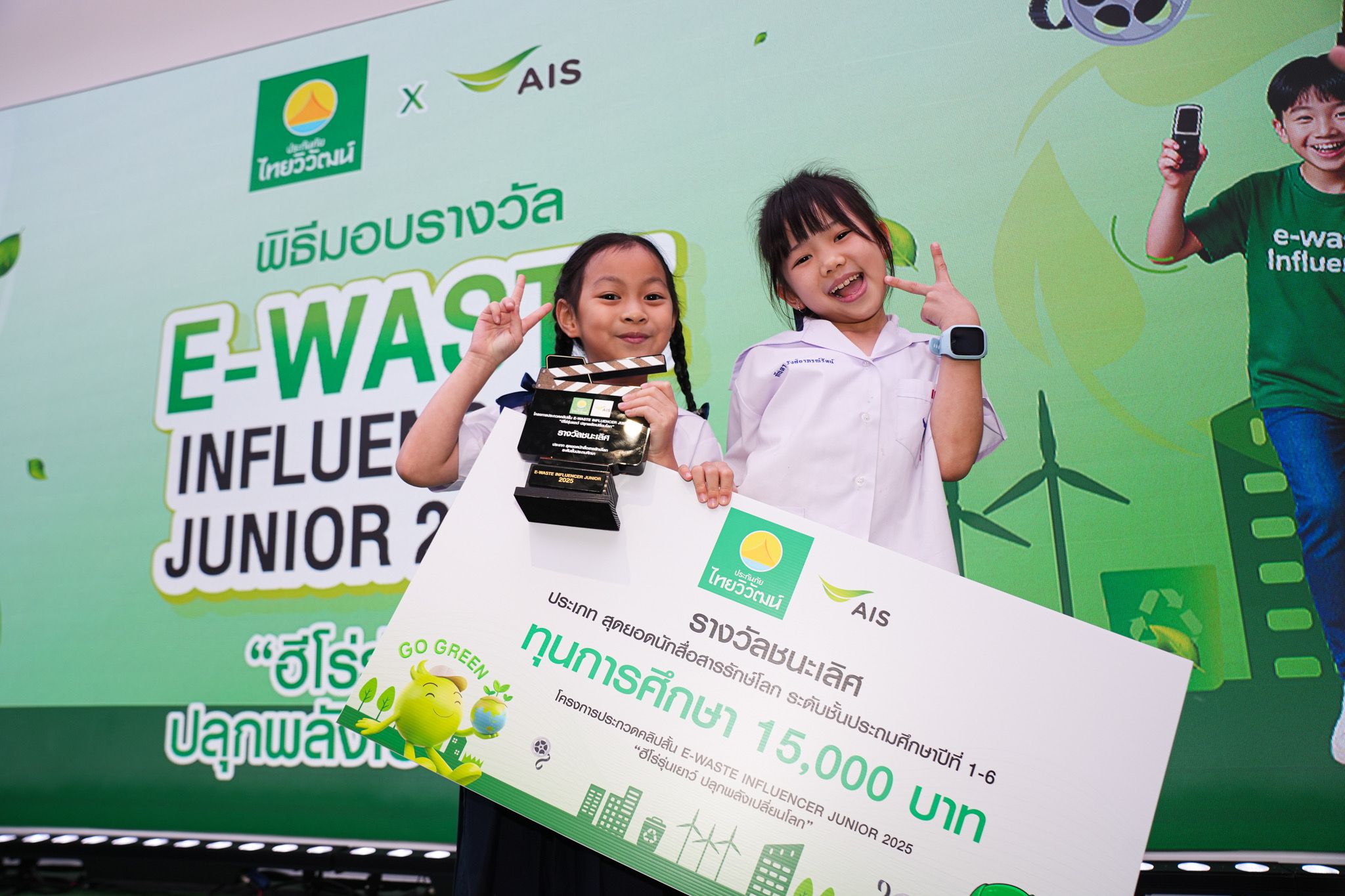 เอไอเอส ร่วมกับ บริษัท ประกันภัยไทยวิวัฒน์ จำกัด (มหาชน) ตอกย้ำความร่วมมือในการขับเคลื่อนการจัดการขยะอิเล็กทรอนิกส์ (E-Waste) อย่างยั่งยืน ผ่านโครงการ “E-Waste Influencer Junior ฮีโร่รุ่นเยาว์ ปลุกพลังเปลี่ยนโลก” เวทีประกวดคลิปวิดีโอสั้นที่เปิดพื้นที่ให้เยาวชนไทยได้แสดงศักยภาพในฐานะนักสื่อสารสิ่งแวดล้อมรุ่นใหม่ ใช้พลังโซเชียลมีเดียเป็นเครื่องมือสร้างการเปลี่ยนแปลงเชิงบวกแก่สังคม มุ่งส่งเสริมให้เด็กและเยาวชนตระหนักถึงปัญหา E-Waste เรียนรู้แนวทางการจัดการอย่างถูกต้อง และร่วมเป็นส่วนหนึ่งในการสร้างเครือข่ายโรงเรียนต้นแบบด้านสิ่งแวดล้อมในอนาคต โดยได้รับการตอบรับเป็นอย่างดี มีผู้ส่งผลงานเข้าร่วมประกวดรวมทั้งสิ้น 295 คลิป แบ่งเป็นระดับประถมศึกษา 27 คลิป และระดับมัธยมศึกษา 268 คลิป สะท้อนถึงพลังการมีส่วนร่วมของเยาวชนไทยทั่วประเทศ