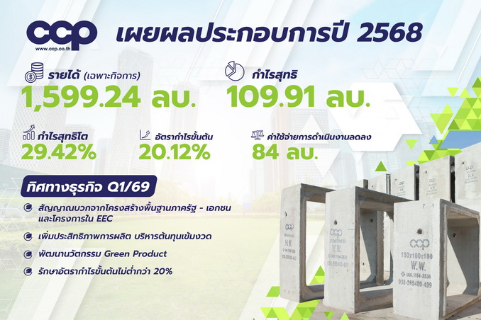 CCP เผยงบเฉพาะกิจการปี 2568 รายได้รวม 1,599.24 ล้านบาท กำไรสุทธิ 109.91 ล้านบาท โต 29.42% งบรวมปี 2568 รายได้ 2,552.77 ล้านบาท กำไร 95.49 ล้านบาท อานิสงส์งานโครงสร้างพื้นฐานภาครัฐเร่งตัว คาดไตรมาส 1/69 การลงทุนภาครัฐ พัฒนาพื้นที่ EEC หนุนการเติบโตต่อ รุกผลิตภัณฑ์คอนกรีต Green Product ตอบโจทย์โครงการเมกะโปรเจกต์ เพิ่มประสิทธิภาพการผลิต ควบคุมต้นทุนเข้ม รักษาอัตรากำไรขั้นต้นระดับ 20%