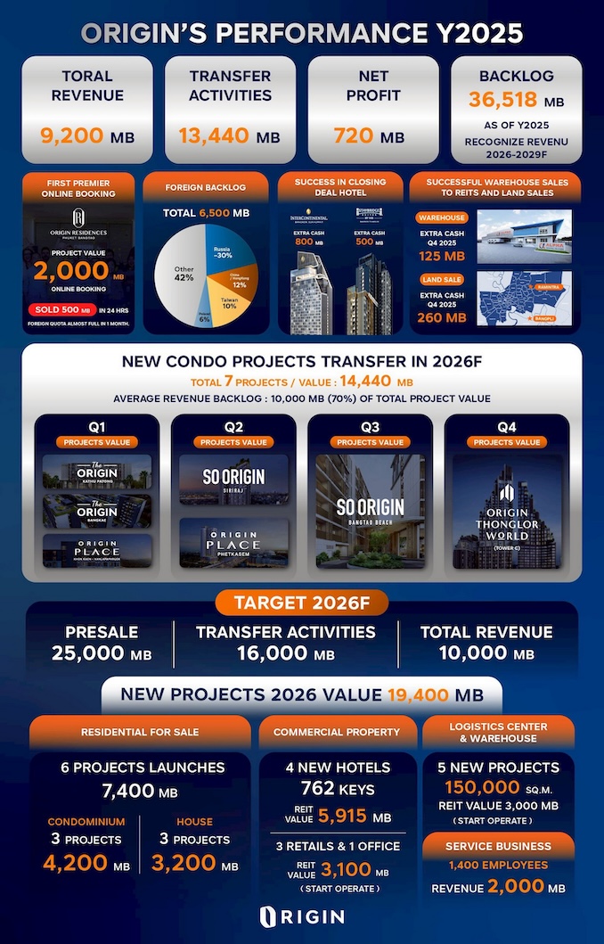 สำหรับปี 2569 ORI ประกาศกลยุทธ์ “ORIGIN Portfolio Evolution 2026” ตั้งเป้ายอดขาย 25,000 ล้านบาท และรายได้รวม 10,000 ล้านบาท พร้อมแผนเปิดโครงการใหม่มูลค่า 19,400 ล้านบาท ครอบคลุมทั้งคอนโด บ้าน โรงแรม อาคารสำนักงาน และคลังสินค้า รวมถึงเตรียมพัฒนา “Origin Vacation Club” เพื่อสร้างมูลค่าเพิ่มและรายได้ระยะยาว