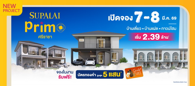 เตรียมพบกับการเปิดจองครั้งแรกอย่างเป็นทางการในวันที่ 7-8 มีนาคม 2569 นี้ กับโอกาสเป็นเจ้าของก่อนใคร พร้อมข้อเสนอพิเศษเฉพาะ 2 วันเท่านั้น! รับ Voucher ทองคำสูงสุด 500,000 บาท* ราคาเริ่มต้นเพียง 2.39 ล้านบาท* สำหรับผู้ที่กำลังมองหาบ้านดีไซน์ใหม่บนทำเลศักยภาพศรีราชา นี่คือจังหวะที่ไม่ควรพลาด ลงทะเบียนรับสิทธิพิเศษวันงาน https://supalai.ly/4qotpDX และสอบถามรายละเอียดเพิ่มเติมได้ที่ โทร. 1720, www.supalai.com หรือ Facebook: Supalai และ ศุภาลัย ชลบุรี ศรีราชา พัทยา (*เงื่อนไขเป็นไปตามที่บริษัทฯ กำหนด)