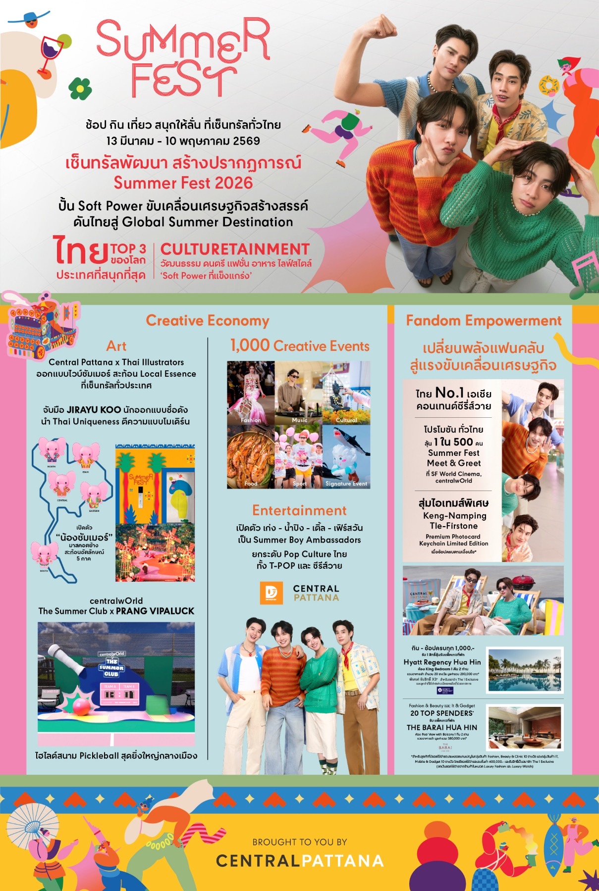 บริษัท เซ็นทรัลพัฒนา จำกัด (มหาชน) ผู้นำอันดับหนึ่งอสังหาริมทรัพย์ไทยเพื่อความยั่งยืน และผู้พัฒนาศูนย์การค้าเซ็นทรัลทั่วประเทศ ทุ่มงบ 600 ล้านบาท ปลุกแคมเปญใหญ่แห่งปี “Summer Fest 2026: Sound of Summer” ปูพรมกว่า 1,000 อีเวนต์ความสนุกทั่วประเทศ