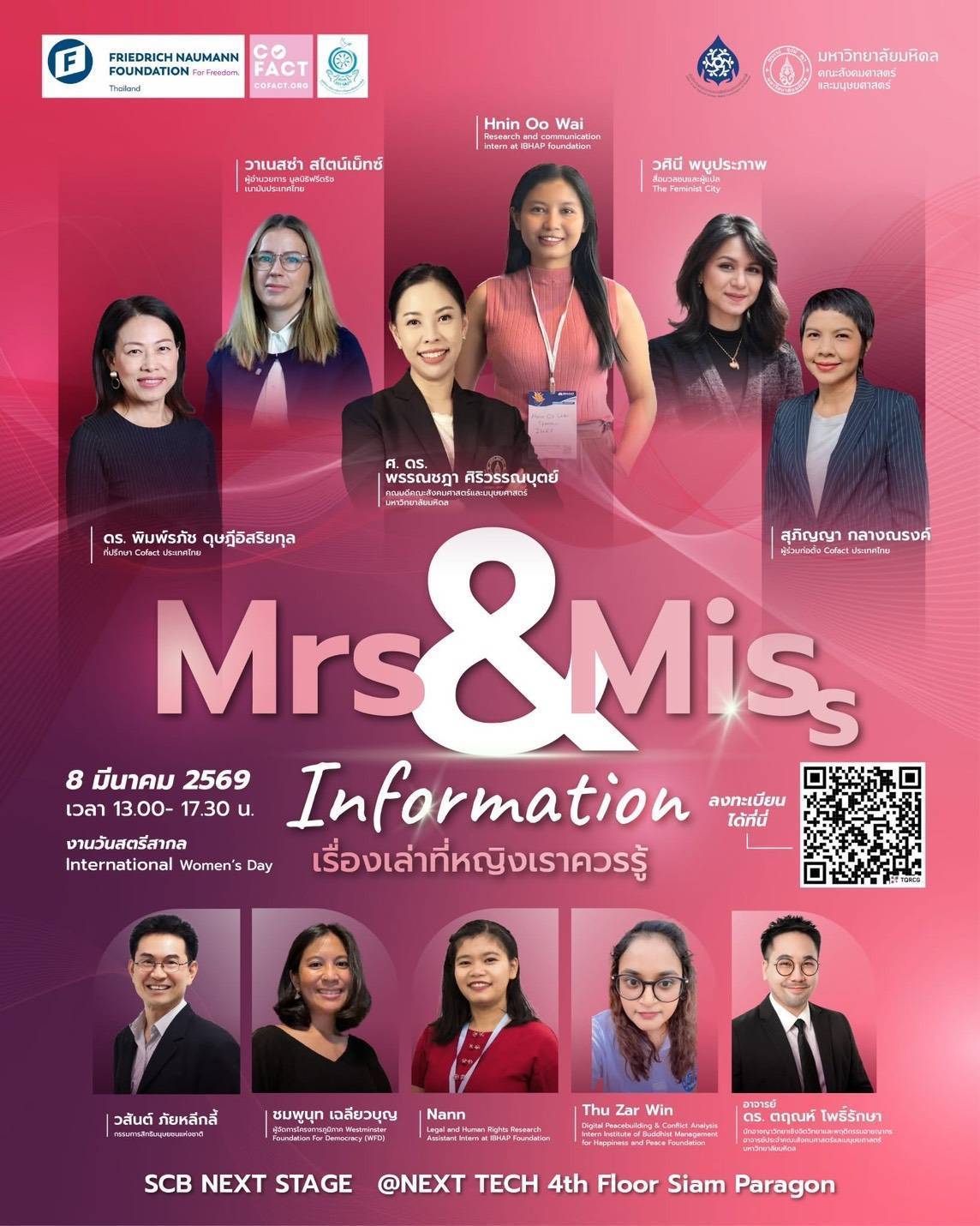 กิจกรรมจากความร่วมมือของ คณะสังคมศาสตร์และมนุษยศาสตร์ มหาวิทยาลัยมหิดล, Friedrich Naumann Foundation, COFACT.ORG, มูลนิธิสถาบันการจัดการวิถีพุทธเพื่อสุขและสันติ และ สำนักงานคณะกรรมการสิทธิมนุษยชนแห่งชาติ เชิญชวนรับฟังมุมมองเกี่ยวกับผู้หญิงในเวทีเสวนาเข้มข้นในหัวข้อ “Mrs.& Miss Information เรื่องเล่าที่หญิงเราควรรู้” โดยเหล่านักวิชาการและผู้เชี่ยวชาญหลากหลายสาขา อาทิ Hnin Oo Wai Research and communication intern at IBHAP foundation, วาเนสซ่า สไตน์เม็ทซ์ ผู้อำนวยการ มูลนิธิฟรีดริชเนามัน ประเทศไทย, วศินี พบูประภาพ สื่อมวลชนและผู้แปล The Feminist City, ศ. ดร. พรรณชฎา ศิริวรรณบุตย์ คณบดีคณะสังคมศาสตร์และมนุษยศาสตร์ มหาวิทยาลัยมหิดล, ดร. พิมพ์รภัช ดุษฎีอิสริยกุล ที่ปรึกษา Cofect ประเทศไทย, สุภิญญา กลางณรงค์ ผู้ร่วมก่อตั้ง Cofect ประเทศไทย, วสันต์ ภัยหลีกลี้ กรรมการสิทธิมนุษยชนแห่งชาติ, ชมพูนุท เฉลียวบุญ ผู้จัดการโครงการภูมิภาค Westminster Foundation For Democracy (WFD), Nann Legal and Human Rights Research และ Assistant Intern at IBHAP Foundation, Thu Zar Win Digital Peacebuilding & Conflict Analysis Intern Institute of Buddhist Management for Happiness and Peace Foundation และ ดร.ตฤณห์ โพธิ์รักษา นักอาชญาวิทยาเชิงจิตวิทยาและพฤติกรรมอาชญากร อาจารย์ประจำคณะสังคมศาสตร์และมนุษยศาสตร์ มหาวิทยาลัยมหิดล รวมถึงเชิญชมนิทรรศการพิเศษเพื่อเฉลอมฉลองวันสตรีสากล ในวันอาทิตย์ที่ 8 มี.ค. 2569 ตั้งแต่เวลา 13.00-17.30 น. ณ SCBX NEXT STAGE @NEXT TECH ชั้น 4 สยามพารากอน