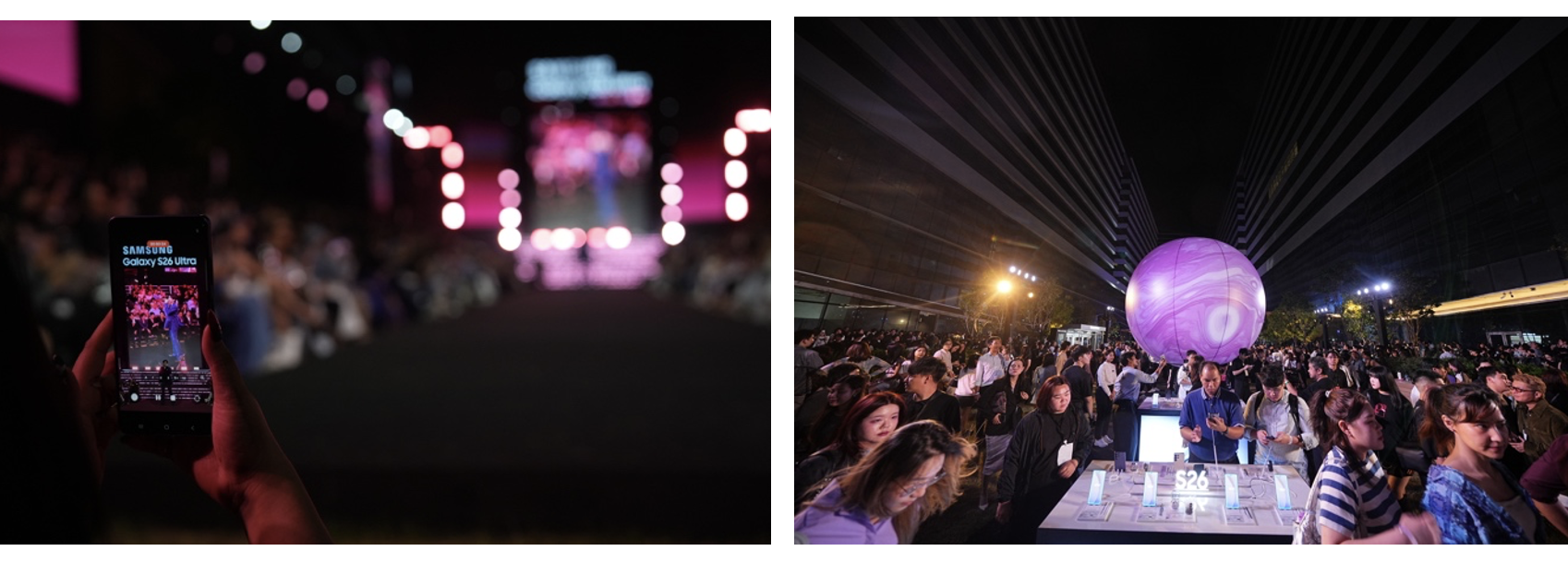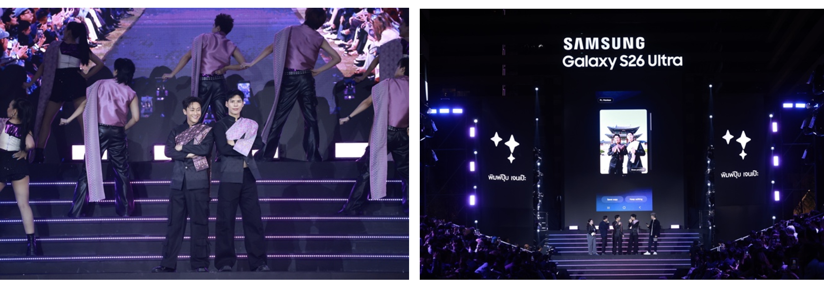 ภายในงาน “Beyond the Galaxy” ซัมซุงยังได้เนรมิตพื้นที่เป็นเวทีรันเวย์ พร้อมดีไซน์โชว์รูปแบบใหม่ ที่เน้นการนำเสนอฟีเจอร์เด่นของ Galaxy S26 Series อย่าง Nightography Runway Show ที่ขนทัพศิลปินจาก #TeamGalaxy อย่าง อิ้งค์ วรันธร, นนท์ ธนนท์, เจษ - ไบเบิ้ล, เติ้ล - เฟิร์สวัน และ สกาย - นานิ ร่วมทำโชว์และเดินแบบบนรันเวย์ในบรรยากาศแสงน้อย เพื่อถ่ายทอดพลังของฟีเจอร์ Nightography การถ่ายภาพแสงน้อยก็รอด บน Galaxy S26 Ultra ที่ได้รับการอัปเกรดเลนส์ Wide และ Telephoto 5 เท่า พร้อมรูรับแสงที่กว้างขึ้น ช่วยให้รับแสงได้มากขึ้น ทำให้ภาพคมชัดแม้ในที่แสงน้อย พร้อม AI ที่ช่วยประมวลผลภาพให้สวยเป็นธรรมชาติในทุกช็อต