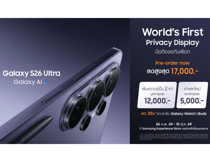 จองเลย! โอกาสสุดท้ายเป็นเจ้าของ Samsung Galaxy S26 Ultra ก่อนใครได้แล้ววันนี้พร้อมรับโปรแรง 3 ต่อ กับ มือถือนวัตกรรม “จอกันเผือก” ครั้งแรกของโลก ที่มาพร้อม Galaxy AI รองรับภาษาไทย ยกระดับประสบการณ์ การใช้งานในทุกด้าน ทั้งการทำงาน ความบันเทิง และการถ่ายภาพ อัปเกรดกล้องใหม่ ภาพถ่ายที่คมชัดและ เก็บรายละเอียดได้ดียิ่งขึ้นในสภาพแสงน้อย สามารถพรีออเดอร์ได้ที่ Samsung Experience Store ร้านค้าที่ร่วมรายการ หรือช่องทางออนไลน์ https://smsngshop.com/s26-pr_buy พร้อมรับ โปรโมชันรวมมูลค่าสูงสุดถึง 17,000 บาท ตั้งแต่วันนี้ ถึง 10 มีนาคมนี้