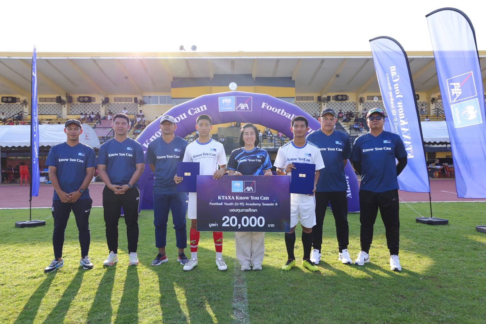 บมจ.กรุงไทย-แอกซ่า ประกันชีวิต นำโดย คุณสุกัญญา อิสรานุวัฒน์ชัย รองประธานอาวุโส ฝ่ายสื่อสารการตลาด และภาพลักษณ์องค์กร (จากขวา คนที่ 4) ให้เกียรติเป็นประธานเปิดงานและกล่าวเปิด โครงการ KTAXA Know You Can Football Youth (U-15) Academy ที่จัดขึ้นอย่างต่อเนื่องเป็นปีที่ 6 ณ สนามกีฬาองค์การบริหารส่วนจังหวัดขอนแก่น โดยมีเยาวชนชาย-หญิง อายุระหว่าง 13-15 ปี เข้าร่วมโครงการกว่า 600 คน เพื่อชิงทุนการศึกษารวมมูลค่า 200,000 บาท พร้อมความคุ้มครองประกันอุบัติเหตุรวมกว่า 5,000,000 บาท สำหรับการคัดเลือกในครั้งนี้ นำโดยโค้ชตุ๊ก ทนงศักดิ์ ประจักกะตา ผู้ฝึกสอนระดับ AFC A License และอดีตนักฟุตบอลทีมชาติไทย พร้อมด้วยทีมโค้ชชั้นนำ AFC Coaching Convention ร่วมพิจารณาคัดเลือก เพื่อให้กระบวนการคัดเลือกเป็นไปตามมาตรฐาน
