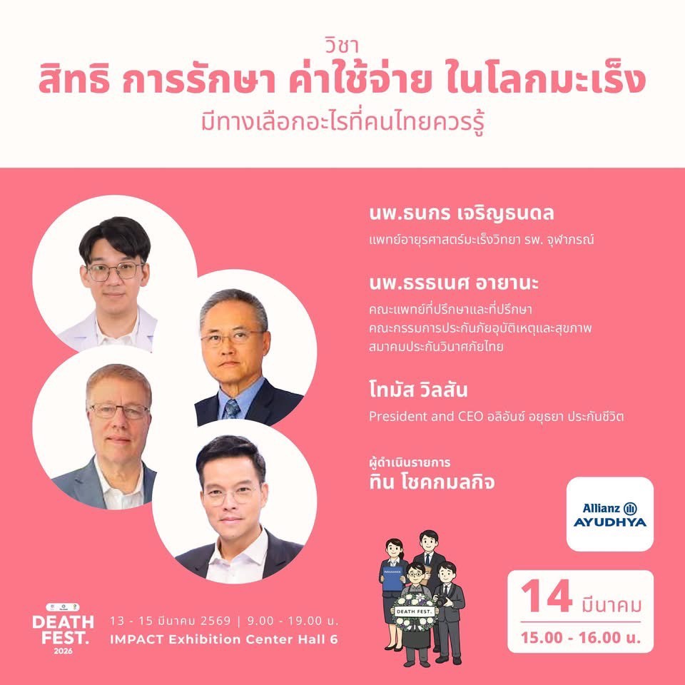 การเข้าร่วมงาน Death Fest 2026 และการเปิดพื้นที่ Cancer City Live Experience ในครั้งนี้ สะท้อนบทบาทของ อลิอันซ์ อยุธยา ในการสนับสนุนให้คนไทยมีความรู้ ความเข้าใจ และความพร้อมในการรับมือกับความเสี่ยงด้านสุขภาพ พร้อมส่งเสริมการวางแผนชีวิตและการดูแลสุขภาพอย่างยั่งยืน ผู้สนใจสามารถเข้าร่วมกิจกรรม Cancer City Live Experience by Allianz Ayudhya ได้ภายในงาน Death Fest 2026 ระหว่างวันที่ 13 – 15 มีนาคม 2569 เวลา 09.00 – 19.00 น. ณ IMPACT Exhibition Center Hall 6