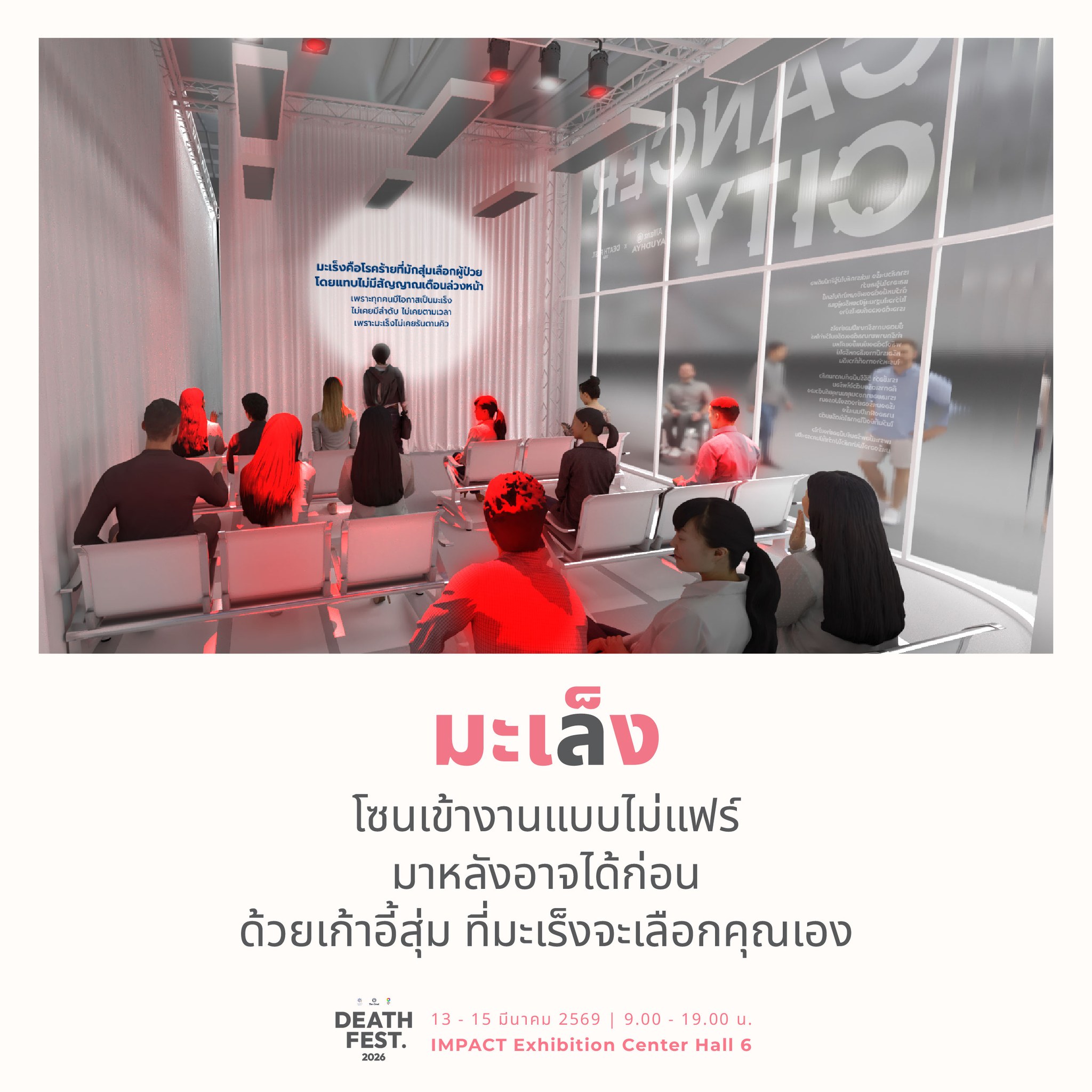 บริษัท อลิอันซ์ อยุธยา ประกันชีวิต จำกัด (มหาชน) เปิดพื้นที่เรียนรู้รูปแบบใหม่ ชวนคนไทยทำความเข้าใจและเตรียมความพร้อมรับมือกับโรคมะเร็ง ผ่านโซนกิจกรรมพิเศษ “Cancer City: Live Experience เตรียมตัวเป็นมะเร็ง” ภายในงาน Death Fest 2026 ซึ่งจะจัดขึ้นระหว่างวันที่ 13 – 15 มีนาคม 2569 เวลา 09.00 – 19.00 น. ณ IMPACT Exhibition Center Hall 6 เพื่อเปิดมุมมองเกี่ยวกับโรคมะเร็ง และส่งเสริมให้สังคมตระหนักถึงความสำคัญของการเตรียมความพร้อมด้านสุขภาพและการวางแผนชีวิต