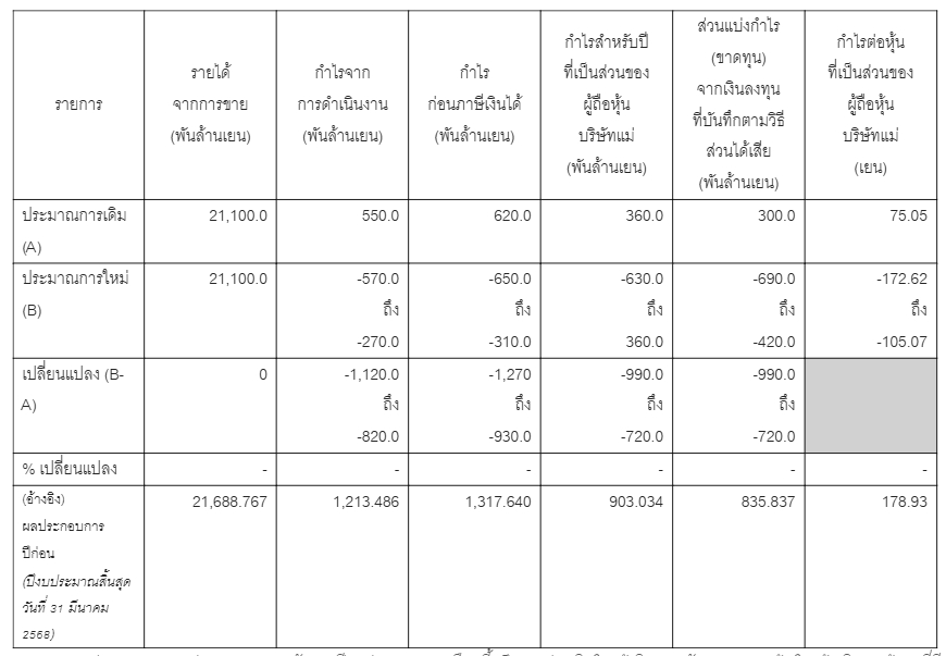 นอกจากนี้ บริษัทคาดว่าจะรับรู้ผลขาดทุนพิเศษในงบการเงินเฉพาะกิจการสำหรับปีงบประมาณเดียวกัน ในช่วง 340,000 ล้านเยน ถึง 570,000 ล้านเยน ทั้งนี้ ตัวเลขดังกล่าวเป็นการประมาณการเบื้องต้น ณ วันที่ 12 มีนาคม 2569 และจะมีการสรุปตัวเลขสุดท้าย ในงบการเงินรวม และงบการเงินเฉพาะกิจการสำหรับปีงบประมาณที่สิ้นสุดวันที่ 31 มีนาคม 2569 นอกจากนี้ ในปีงบประมาณถัดไปรวมถึงหลังจากนี้ ฮอนด้า อาจมีค่าใช้จ่ายหรือผลกระทบเพิ่มเติมที่เกี่ยวข้องกับการทบทวนแผนกลยุทธ์ด้านรถยนต์ไฟฟ้าดังกล่าว เมื่อรวมกับผลกระทบที่คาดว่าจะรับรู้ในปีงบประมาณปัจจุบัน คาดว่ามูลค่าผลกระทบรวมอาจสูงสุดไม่เกิน 2.5 ล้านล้านเยน ทั้งนี้ ตัวเลขดังกล่าวเป็นการประมาณการจากข้อมูลที่มีอยู่ ณ ปัจจุบัน และยังมีความไม่แน่นอน ซึ่งอาจส่งผลให้ผลกระทบที่เกิดขึ้นจริงแตกต่างจากการประมาณการดังกล่าว อีกทั้งเพื่อรักษาเสถียรภาพและความต่อเนื่องในการจ่ายเงินปันผลแก่ผู้ถือหุ้น ฮอนด้า ได้นำอัตรา DOE (Dividend on Equity) มาใช้เป็นตัวชี้วัดหลักในการจัดสรรผลตอบแทนให้ผู้ถือหุ้น ดังนั้น แม้จะมีการปรับประมาณการ ผลประกอบการรวมสำหรับปีงบประมาณสิ้นสุดวันที่ 31 มีนาคม 2569 บริษัทฯ ได้ตัดสินใจไม่ปรับเปลี่ยน ประมาณการเงินปันผลต่อหุ้นสำหรับปีงบประมาณนี้