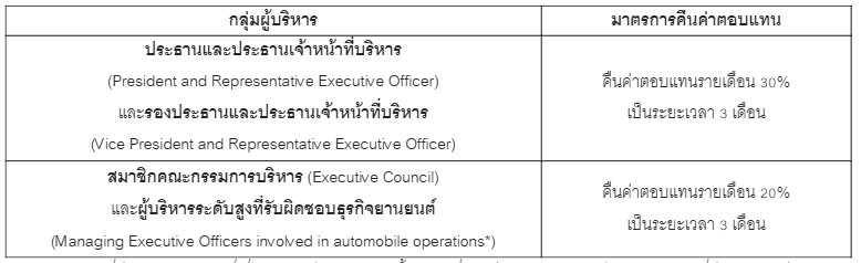 นอกจากนี้ ฮอนด้า ยังตัดสินใจให้ประธานและประธานเจ้าหน้าที่บริหาร รวมถึงรองประธานและประธานเจ้าหน้าที่บริหาร งดรับค่าตอบแทนตามผลงานระยะสั้น (Short‑Term Incentive: STI) สำหรับปีงบประมาณสิ้นสุดวันที่ 31 มีนาคม 2569 จากมาตรการดังกล่าว ส่งผลให้ ค่าตอบแทนรวมรายปีของผู้บริหารระดับสูงลดลงประมาณ 25 - 30% จากระดับปกติ