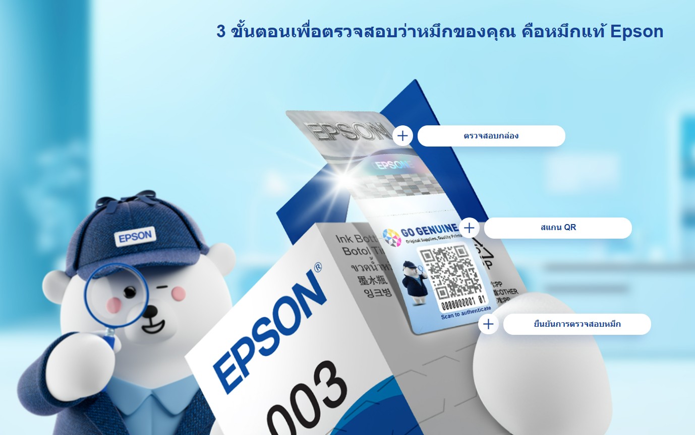 ทั้งนี้ เอปสันแนะนำให้ผู้บริโภคเลือกซื้อหมึกจากตัวแทนจำหน่ายที่ได้รับอนุญาตหรือร้านค้าออนไลน์อย่างเป็นทางการเท่านั้น โดยสามารถค้นหาร้านค้าตัวแทนจำหน่ายเอปสันได้ที่ https://www.epson.co.th/find-a-store พร้อมทั้งตรวจสอบเบื้องต้นจากโลโก้สามมิติบนกล่องบรรจุภัณฑ์ที่สามารถมองเห็นเมื่อกระทบแสง รวมถึงสแกนคิวอาร์โค้ดบนกล่องผ่านแอปพลิเคชัน Epson Genuine ซึ่งดาวน์โหลดได้ฟรีจาก Apple App Store และ Google Play โดยระบบจะแสดงผลทันทีว่าสินค้าเป็นของแท้หรือของปลอม ซึ่งจะเริ่มให้บริการตั้งแต่วันที่ 1 เมษายน 2569 เป็นต้นไป สามารถดูคำแนะนำขั้นตอนได้ที่ https://www.epson.co.th/genuineinks