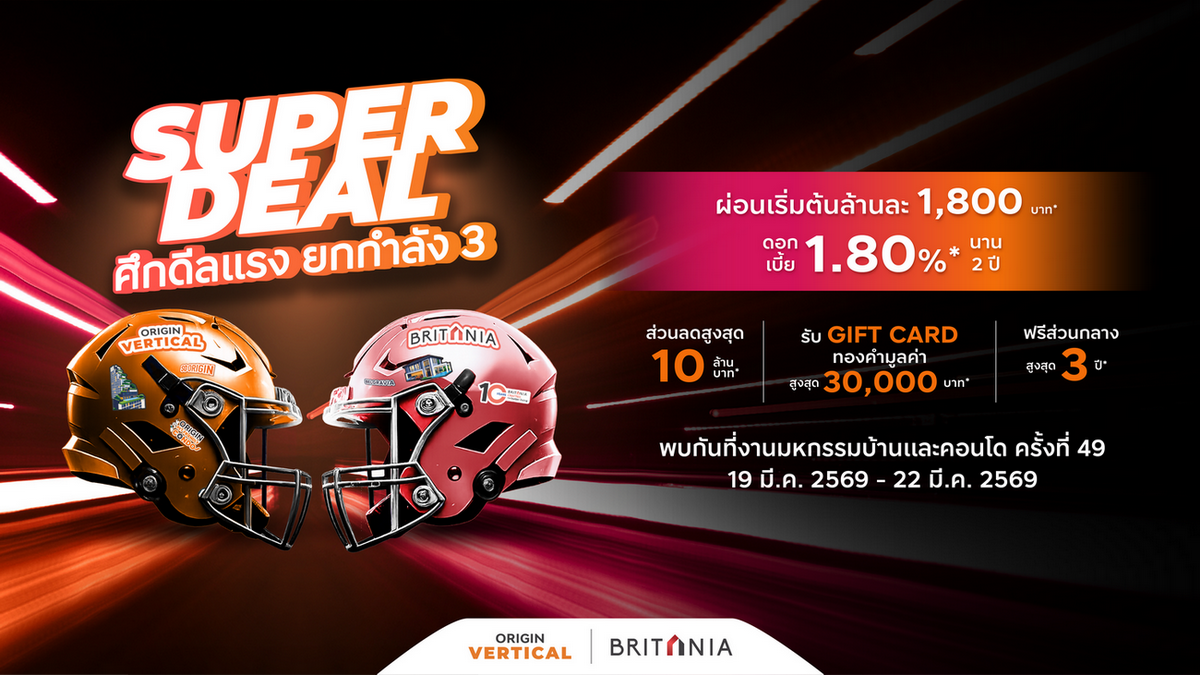 ออริจิ้น เวอร์ติเคิล – บริทาเนีย แทคทีมเปิดสนาม แคมเปญ “Super Deal ศึกดีลแรง ยกกำลัง 3” คอนโด-บ้าน อัดโปรแรง ลดสูงสุด 10 ล้านบาท* ปิดดีลรับโบนัส Gift Card ทองคำ มูลค่าสูงสุด 30,000 บาท* พร้อมจับมือพันธมิตรธนาคารชั้นนำ ปล่อยดอกเบี้ยพิเศษ! 1.80%* ผ่อนเริ่มต้นล้านละ 1,800 บาท* นาน 2 ปี* ดีลแรงแบบนี้ไม่ได้มีทุกเกม ใครช้า…อาจพลาดโปรที่ดีที่สุดของสนามนี้ พบกัน Game Day! ในงานมหกรรมบ้านและคอนโด ครั้งที่ 49 วันที่ 19-22 มีนาคม 2569 เท่านั้น