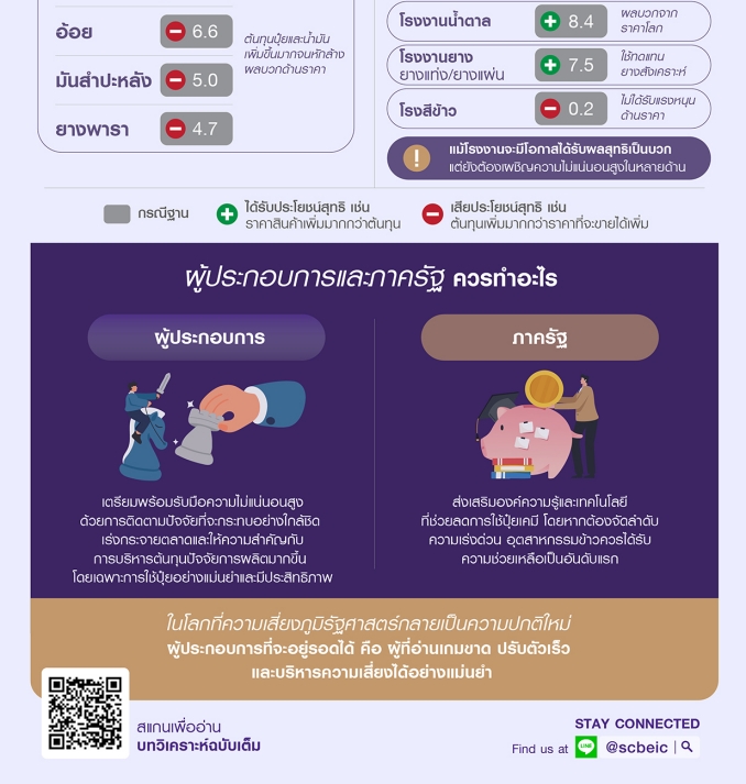 SCB EIC ระบุว่า หากพิจารณาภายใต้ทั้งกรณีฐานและกรณีรุนแรง เกษตรกรผู้ปลูกพืชทั้ง 5 ชนิดมีแนวโน้มได้รับผลกระทบสุทธิเป็นลบ โดยกลุ่มที่ได้รับแรงกดดันมากที่สุดคือ “ข้าว” รองลงมาคือ ปาล์มน้ำมัน อ้อย มันสำปะหลัง และยางพารา สะท้อนว่าภาคการผลิตต้นน้ำยังเปราะบางต่อความผันผวนของต้นทุนโลกอย่างมาก