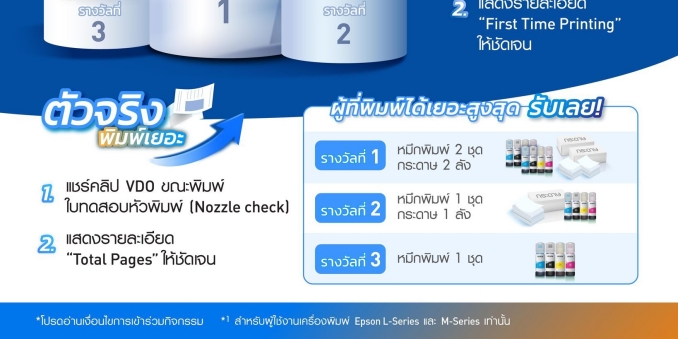 ตัวจริงพิมพ์เยอะ ผู้ร่วมกิจกรรมต้องแสดงข้อมูล “Total Pages” ในใบทดสอบหัวพิมพ์ โดยผู้ที่มีจำนวนหน้าการพิมพ์สูงสุด 3 อันดับแรก จะได้รับรางวัลหมึกพิมพ์ Epson พร้อมกระดาษพิมพ์ ทั้งนี้ หมึกพิมพ์ที่มอบให้แก่ผู้ชนะจะเป็นรุ่นที่สอดคล้องกับเครื่องพิมพ์ Epson EcoTank ที่ใช้เข้าร่วมกิจกรรม