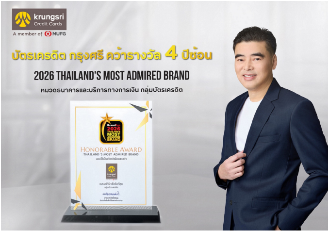 นายสมหวัง โตรักตระกูล กรรมการผู้จัดการ บริษัท บัตรกรุงศรีอยุธยา จำกัด เป็นตัวแทนบัตรเครดิต กรุงศรี รับรางวัล “แบรนด์ที่น่าเชื่อถือที่สุด” - 2026 Thailand’s Most Admired Brand ในหมวดธนาคารและบริการทางการเงิน กลุ่มบัตรเครดิต ซึ่งจัดโดยนิตยสาร BrandAge ต่อเนื่องเป็นปีที่ 4