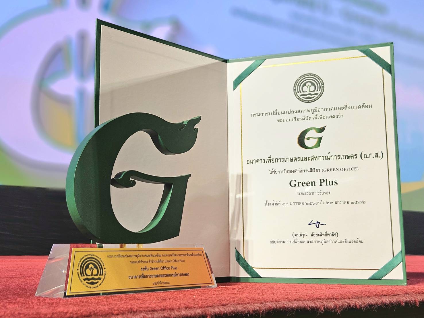 โดย ธ.ก.ส. มีความมุ่งมั่นในการขยายผลการดำเนินงานโครงการสำนักงานสีเขียวสู่สาขาทั่วประเทศ เพื่อสนับสนุนเป้าหมายของรัฐบาลที่มุ่งสู่การปล่อยก๊าซเรือนกระจกสุทธิเป็นศูนย์ (Net Zero) ในปี 2050 ด้วยการใช้พลังงานอย่างมีประสิทธิภาพ ส่งเสริมพลังงานสะอาด และพร้อมรับมือการเปลี่ยนแปลง สภาพภูมิอากาศต่อไป ทั้งนี้ งานประกาศเกียรติคุณตราสัญลักษณ์ G-Green ระดับประเทศ