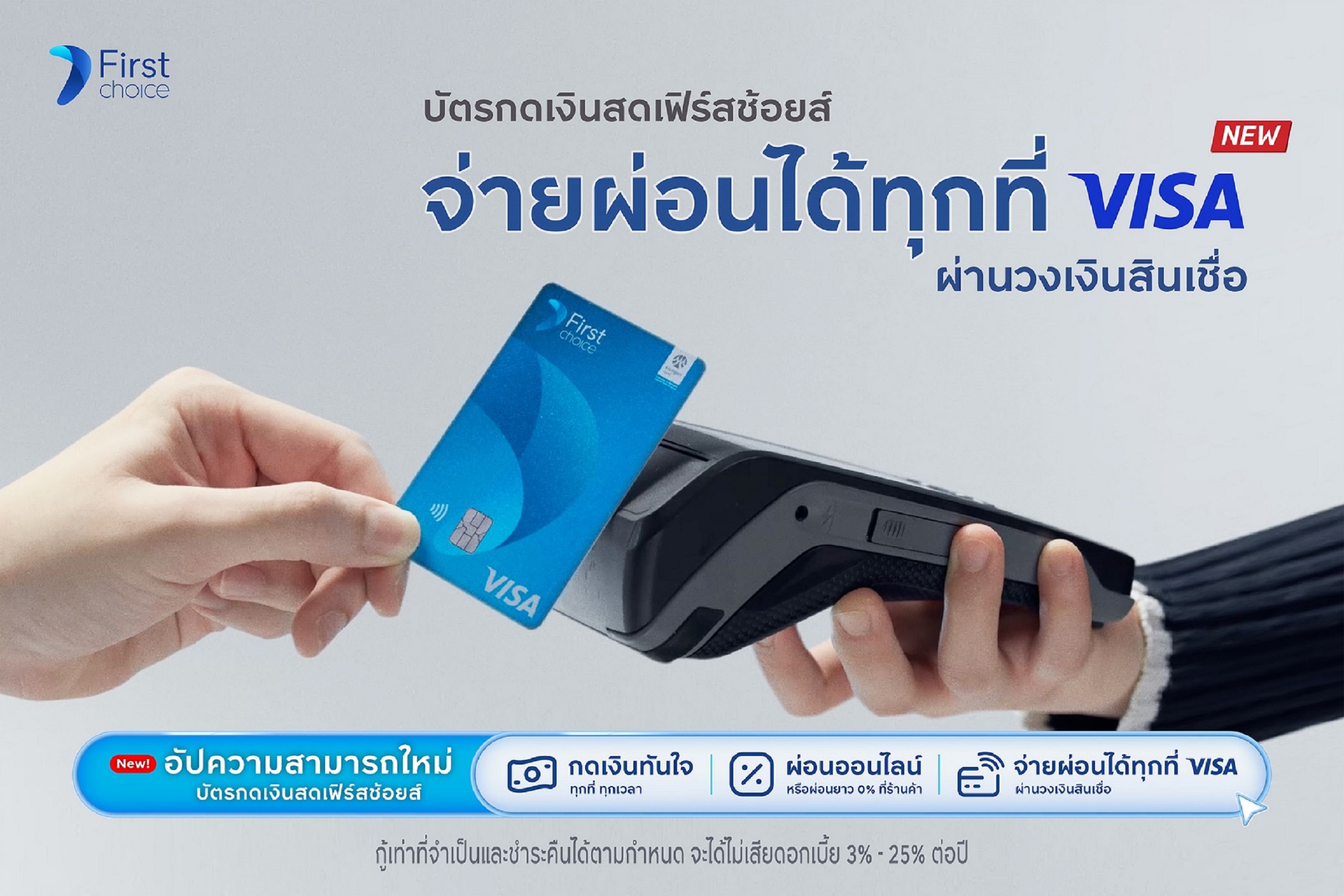 บัตรกดเงินสดเฟิร์สช้อยส์โฉมใหม่โดดเด่นด้วยนวัตกรรมการชำระเงินที่อัปความสามารถไปอีกขั้น เพิ่มความสะดวก ตอบโจทย์ไลฟ์สไตล์การใช้จ่ายยุคใหม่ รองรับทุกรายจ่ายที่คาดไม่ถึงด้วยบริการหลากหลายในบัตรเดียว ทั้งกดเงินทันใจ ทุกที่ ทุกเวลา ผ่านแอป UCHOOSE หรือผ่านตู้ ATM และบริการผ่อนยาว 0% ที่ร้านค้าพันธมิตรแบรนด์ดังมากกว่า 20,000 ร้านทั่วประเทศ และบริการใหม่ จ่ายผ่อนได้ทุกที่ที่มีสัญลักษณ์ VISA ผ่านวงเงินสินเชื่อ และผ่อนออนไลน์ได้บนแพลตฟอร์มออนไลน์ชั้นนำ มั่นใจกับระบบ VISA 3D Secure เพิ่มความปลอดภัยกับทุกการใช้จ่ายออนไลน์ สมัครง่ายผ่านแอปพลิเคชัน UCHOOSE หรือผ่านเว็บไซต์ First Choice หรือยื่นเอกสาร อนุมัติ รับบัตรทันใจที่สาขาเฟิร์สช้อยส์ทั่วประเทศ รู้ผลอนุมัติ ได้ไวใน 30 นาที