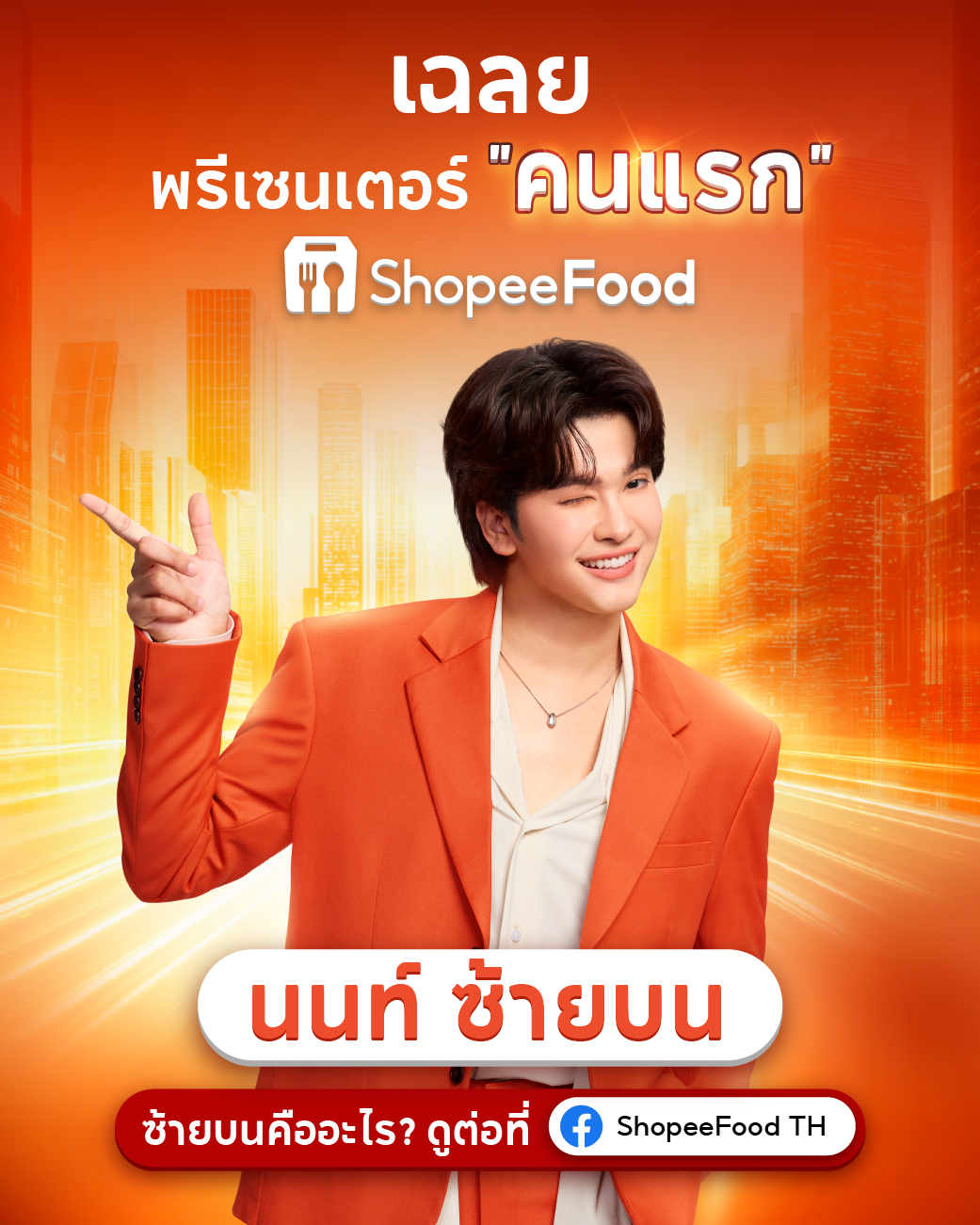 ShopeeFood บริการสั่งอาหารออนไลน์บนแอป Shopee เปิดตัว นนท์ ธนนท์ ศิลปินนักร้องชื่อดังของไทย ในฐานะพรีเซนเตอร์คนแรก เพื่อร่วมสร้างการรับรู้เกี่ยวกับบริการสั่งอาหารที่ช่วยให้ผู้ใช้งานสามารถสั่งเมนูโปรดจากร้านอาหารหลากหลายที่ทั้งสะดวกและคุ้มค่ามากยิ่งขึ้นภายในแอปเดียว