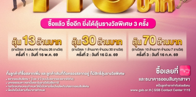 ผู้สนใจซื้อสลากออมสินเพิ่มเติมเพื่อร่วมกิจกรรม “ฉลอง 113 ปี เพิ่มเงินรางวัล เพิ่มจำนวนรางวัล กับสลากออมสินพิเศษ 1 ปี และ 2 ปี (แบบใบสลากและสลากดิจิทัล) เงินรางวัลรวม 113 ล้านบาท” สามารถติดต่อได้ที่ธนาคารออมสินทุกสาขา หรือกดซื้อด้วยตนเองทางแอปพลิเคชัน MyMo ศึกษารายละเอียดได้ที่เว็บไซต์ธนาคารออมสิน www.gsb.or.th หรือสอบถามเพิ่มเติมที่ GSB Contact Center โทร. 1115