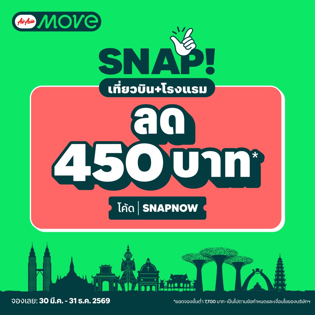AirAsia MOVE จัดเต็มดีลสุดคุ้มต้อนรับฤดูกาลท่องเที่ยว (High Season) ให้คุณออกไปสำรวจโลกได้ในราคาประหยัดกว่าเดิม ด้วยส่วนลดพิเศษสำหรับจองโรงแรมทั่วโลก ลดเพิ่มทันที 400 บาท เพียงใส่โค้ด MOVEHOTELS50 (เมื่อมียอดจองขั้นต่ำ 3,000 บาท) และสำหรับสายเที่ยวแบบแพ็กเกจสุดคุ้มกับ SNAP! (เที่ยวบิน+โรงแรม) ทุกจุดหมายปลายทาง รับส่วนลดเพิ่ม 450 บาท เมื่อใส่โค้ด SNAPNOW (เมื่อมียอดจองขั้นต่ำ 7,700 บาท) จองเลยวันนี้ที่แอป AirAsia MOVE เพื่อสัมผัสประสบการณ์ "บิน พัก เที่ยว แอปเดียวครบ" ในราคาสบายกระเป๋า