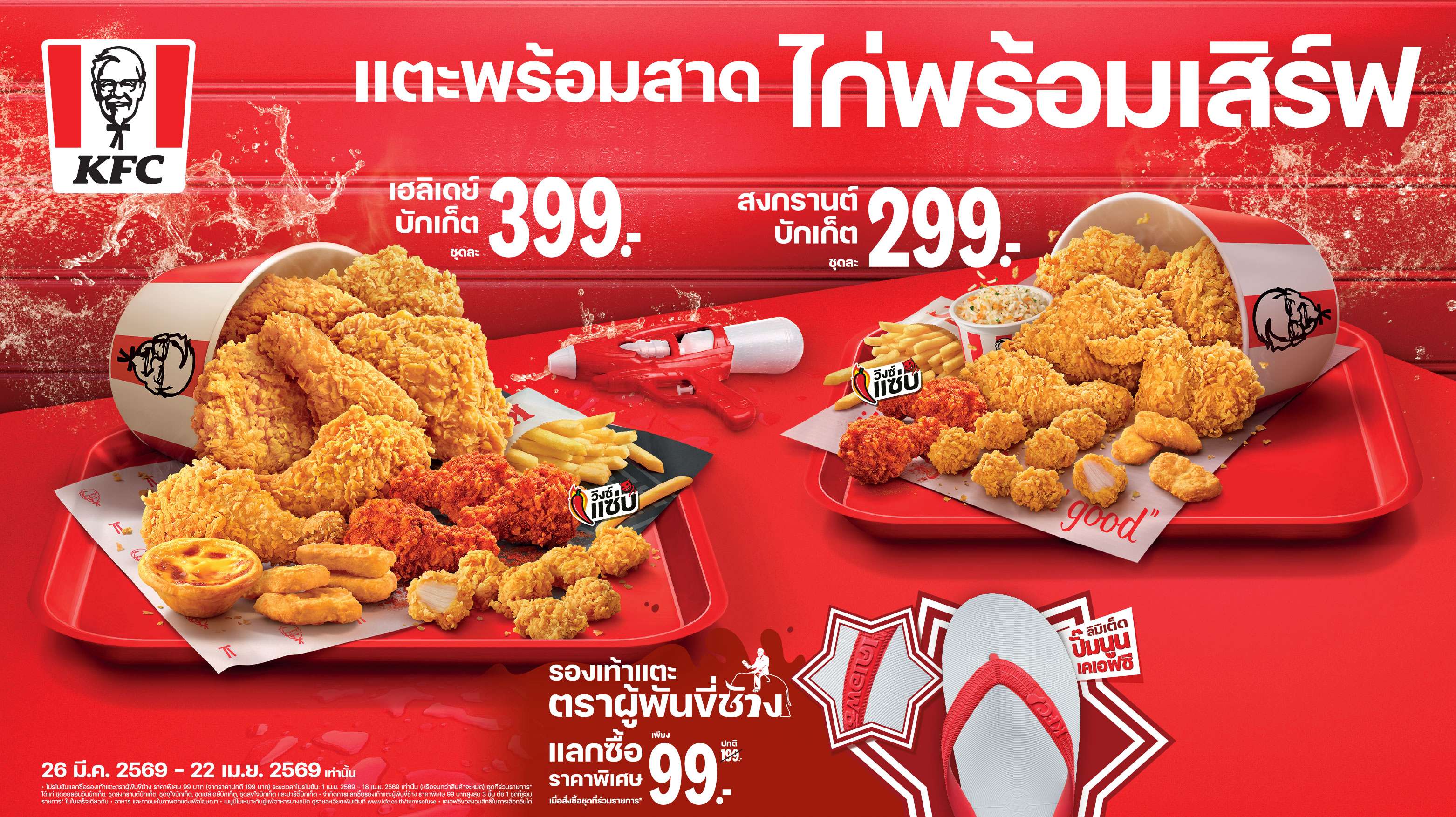 สำหรับใครที่กำลังมองหาไอเท็มคู่ใจไว้ลุยน้ำ ขยายความสนุกให้ตัวเท่าช้าง สามารถแลกซื้อ “รองเท้าแตะผู้พันขี่ช้าง” ได้ในราคาเพียง 99 บาท ที่ร้าน KFC ทุกสาขาทั่วประเทศ (ยกเว้นสาขาสนามบินดอนเมือง และสุวรรณภูมิ) หรือเลือกสั่งความอร่อยได้สะดวกผ่าน KFC Delivery บนเว็บไซต์, KFC App และแพลตฟอร์มเดลิเวอรีทุกช่องทาง พร้อมสิทธิ์แลกซื้อในราคา 129 บาท โดยสามารถแลกซื้อได้สูงสุด 3 คู่ ต่อ 1 ชุดบักเก็ตที่ร่วมรายการ ได้แก่ ออลอินวันบักเก็ต, สงกรานต์ บักเก็ต, ชุดจุใจ, เฮลิเดย์ บักเก็ต, ชุดสุขใจ และปาร์ตี้บักเก็ต ตั้งแต่วันที่ 1 – 18 เมษายน 2569