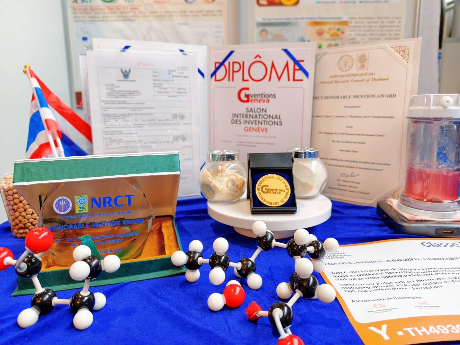 สำหรับนวัตกรรม “โปรตีนถั่ว-เหลืองแบบใหม่” (Innovative Soya) ช่วยลดปัญหาเรื่องกลิ่นถั่ว ทำให้ผู้บริโภครับประทานได้ง่ายขึ้น พร้อมเพิ่มความน่ารับประทานและระดับโปรตีนในวัตถุดิบ จึงสามารถนำไปต่อยอดสู่ผลิตภัณฑ์ plant-based ให้มีรสชาติที่ดีและยังคงคุณค่าทางโภชนาการ ตอบโจทย์ผู้บริโภคยุคใหม่ เป็นผลงานที่ได้รับรางวัล Honorable Mention จากสำนักงานการวิจัยแห่งชาติ (วช.) มาด้วยก่อนที่จะคว้าเหรียญทองในระดับโลก โดยมี ดร.สุดารัตน์ เล็ดลอด หัวหน้าทีมวิจัยโปรตีนทางเลือก สำนักวิจัยโปรตีนทางเลือก CPF RD Center เป็นหัวหน้าทีมวิจัย