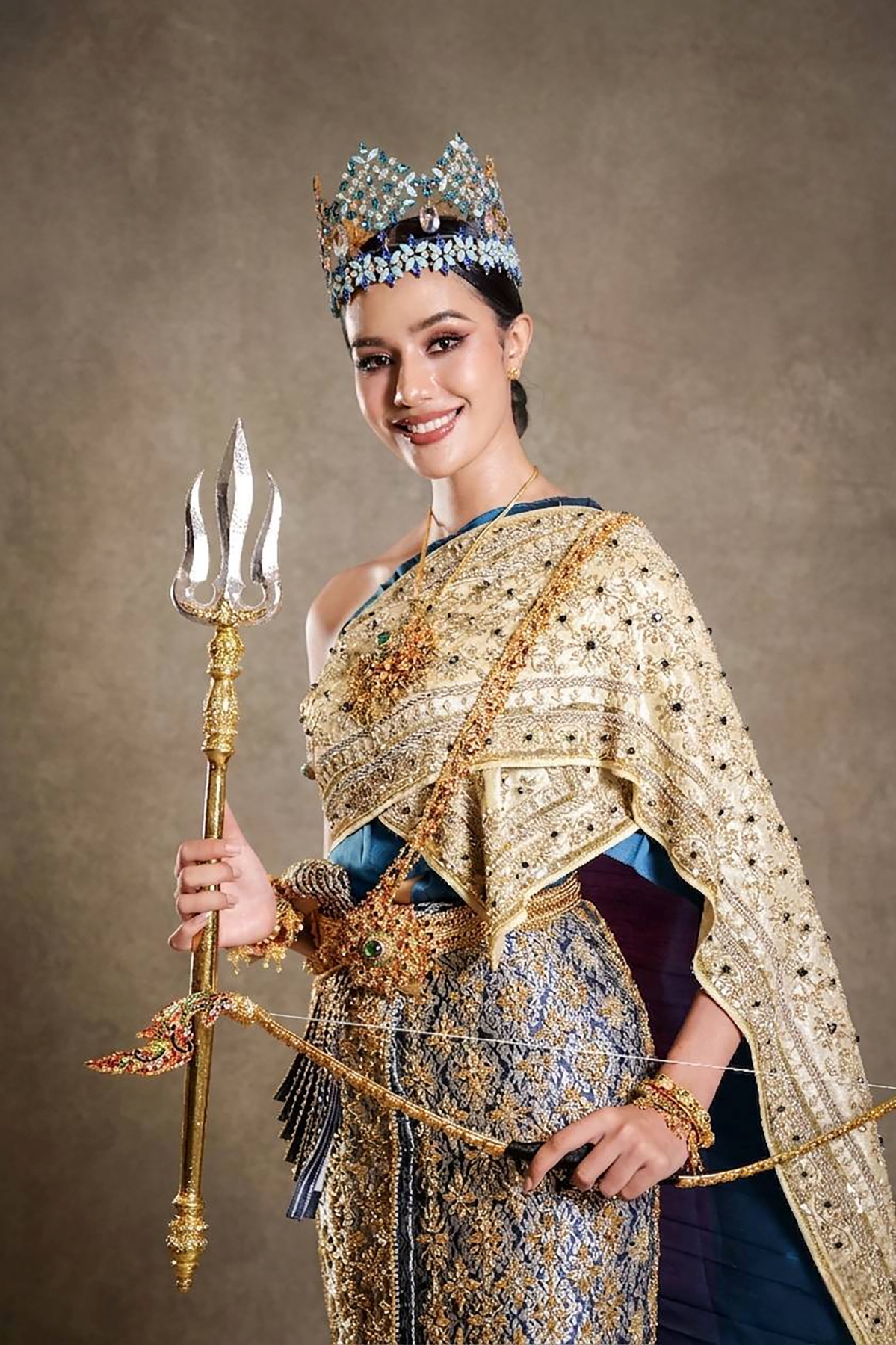ความวิจิตรของชุดนางสงกรานต์ในปีนี้ ได้รับแรงบันดาลใจจาก “ชุดไทยจักรพรรดิ” หนึ่งในชุดไทยพระราชนิยม นำมาตีความใหม่อย่างประณีตในมิติร่วมสมัย สะท้อนอัตลักษณ์งดงามเหนือกาลเวลา ตัวชุดรังสรรค์จาก “ผ้าไหมยกใหญ่ลำพูน” มรดกหัตถศิลป์ชั้นสูงของไทย ผสานสไบผ้าไหมปักลวดลายละเอียดด้วยเทคนิคขั้นสูง เสริมมิติด้วยสไบอัดกลีบในเฉดเดียวกับมงกุฎ เกิดเป็นความกลมกลืนระหว่างเครื่องแต่งกายและศิราภรณ์อย่างวิจิตรบรรจง ถ่ายทอดความสง่างามในระดับ Haute Couture ได้อย่างสมบูรณ์แบบ ผลงานการออกแบบโดย ดร.สรรค์ สุดเกตุ แห่ง Vanus Couture ผู้เชี่ยวชาญในการยกระดับ “ชุดไทย” สู่เวทีแฟชั่นโลก ทรงพาหุรัดทัดดอกบัวหลวง อันเป็นสัญลักษณ์แห่งความบริสุทธิ์ ความรุ่งเรือง และจิตวิญญาณแบบไทย พระหัตถ์ขวาทรงตรีศูล แทนพลังอำนาจและความแข็งแกร่ง พระหัตถ์ซ้ายทรงธนู สื่อถึงปัญญาและความแม่นยำ สะท้อนสมดุลระหว่างความอ่อนช้อยและพลังภายในได้อย่างงดงาม