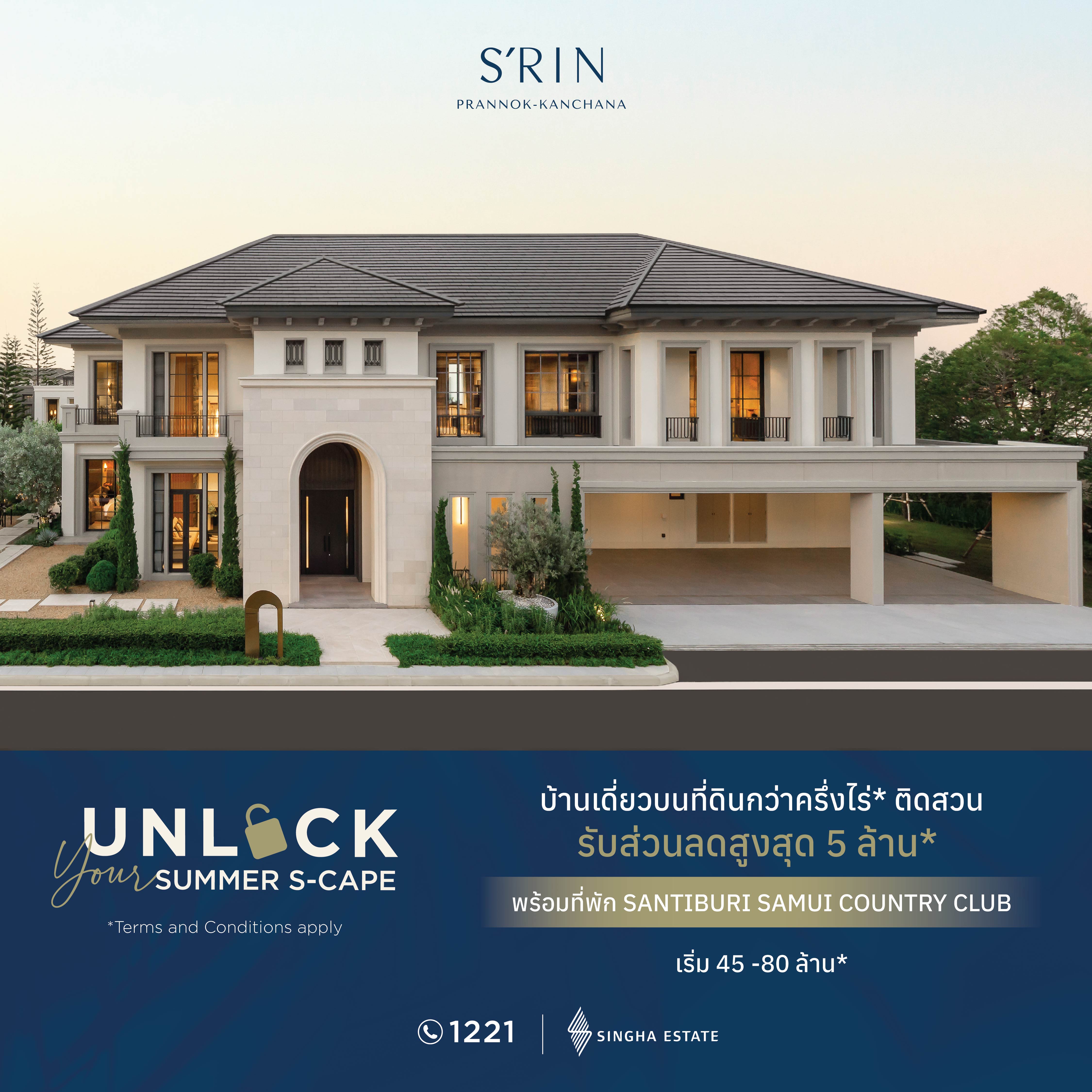 โครงการบ้านเดี่ยวระดับพรีเมียมลักชูรีแบรนด์ “สริน” (S’RIN) บน 2 ทำเลศักยภาพ ได้แก่ “สริน พรานนก-กาญจนา” โดดเด่นด้วยที่ดินแปลงพิเศษขนาดใหญ่กว่า ครึ่งไร่* ใกล้สวนและคลับเฮาส์ ราคาเริ่มต้น 45 – 80 ล้านบาท* และ “สริน ราชพฤกษ์-สาย 1” มอบความเป็นส่วนตัวด้วยแปลงพิเศษหน้าโครงการ ใกล้คลับเฮาส์ ราคาเริ่มต้น 42 – 75 ล้านบาท* พร้อมข้อเสนอพิเศษ รับส่วนลดสูงสุด 5 ล้านบาท และแพ็กเกจที่พัก 3 วัน 2 คืน สำหรับ 2 ท่าน ที่ Santiburi Samui Country Club ห้อง Grand Reserve Pool Villa พร้อมดินเนอร์สุดพิเศษ และเที่ยวบินจาก Bangkok Airways เพื่อประสบการณ์การการพักผ่อนอย่างสมบูรณ์แบบ