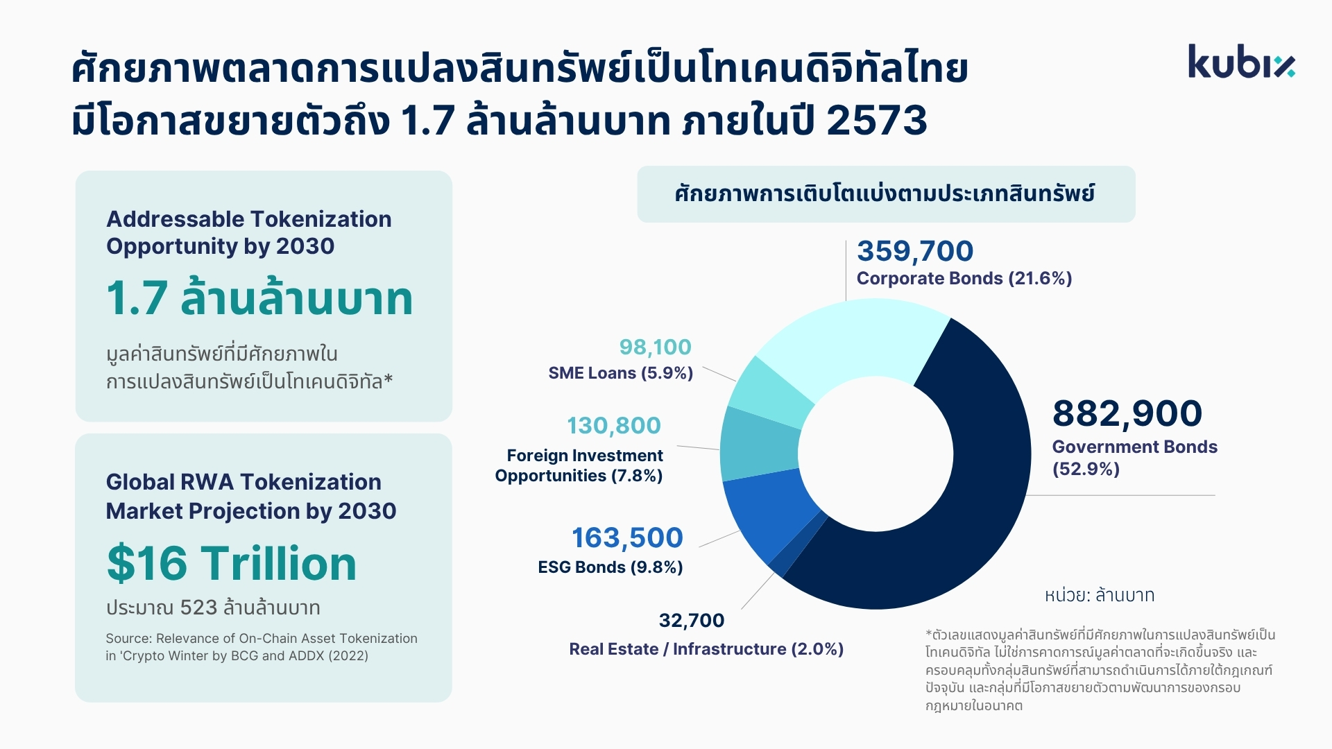 บริษัท คิวบิกซ์ ดิจิทัล แอสเสท จำกัด (kubix) ผู้ให้บริการระบบเสนอขายโทเคนดิจิทัล (ICO Portal) ชั้นนำของไทย ร่วมกับโอนิกิริ แคปิทัล (Onigiri Capital) กองทุนร่วมลงทุนในเครือเซย์ซอน แคปิทัล (Saison Capital) หน่วยงานด้านการลงทุนของกลุ่มบริษัทเครดิต เซย์ซอน ประเทศญี่ปุ่น เผยแพร่รายงานวิจัยเชิงลึก “Project Thara: Institutionalizing Real-World Asset Tokenization-Where Thailand’s Real Economy Meets Digital Capital” การยกระดับการแปลงสินทรัพย์ในโลกจริงเป็นโทเคนดิจิทัลในระดับสถาบัน เพื่อวิเคราะห์ศักยภาพและทิศทางการเติบโตของตลาดการแปลงสินทรัพย์เป็นโทเคนดิจิทัลในประเทศไทย คาดมีมูลค่าโอกาสทางเศรษฐกิจสูงถึง 51,000 ล้านดอลลาร์สหรัฐ หรือราว 1.7 ล้านล้านบาท ภายในปี 2573