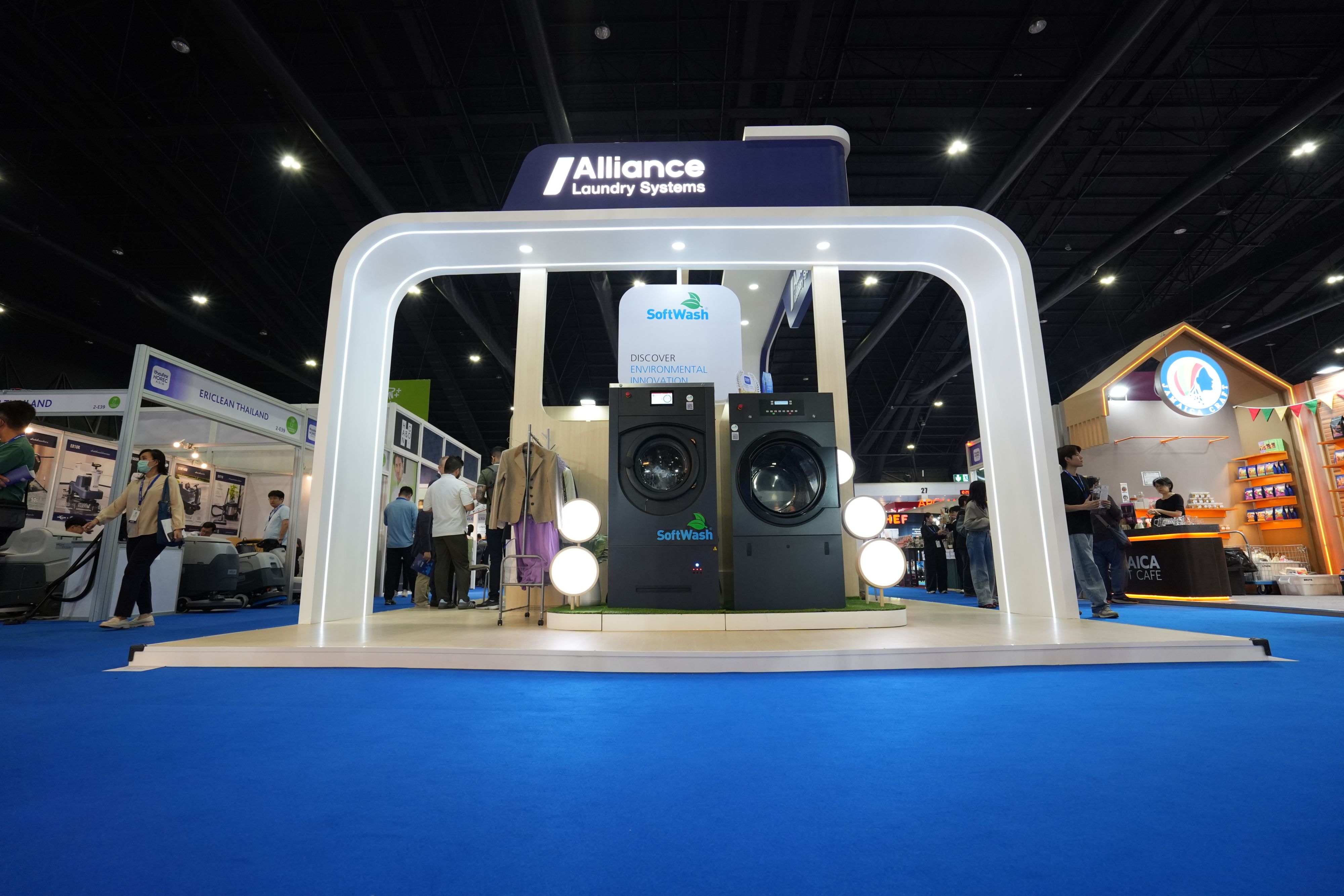 ในปีนี้ บูธของ Alliance Laundry Systems (ALS) ถูกออกแบบโดยได้แรงบันดาลใจจากแนวคิด “Circular Living” ที่สะท้อนการออกแบบที่เชื่อมโยงระหว่างเทคโนโลยีกับผู้คน ให้เข้ากับสภาพแวดล้อมของการซักผ้าในชีวิตประจำวัน