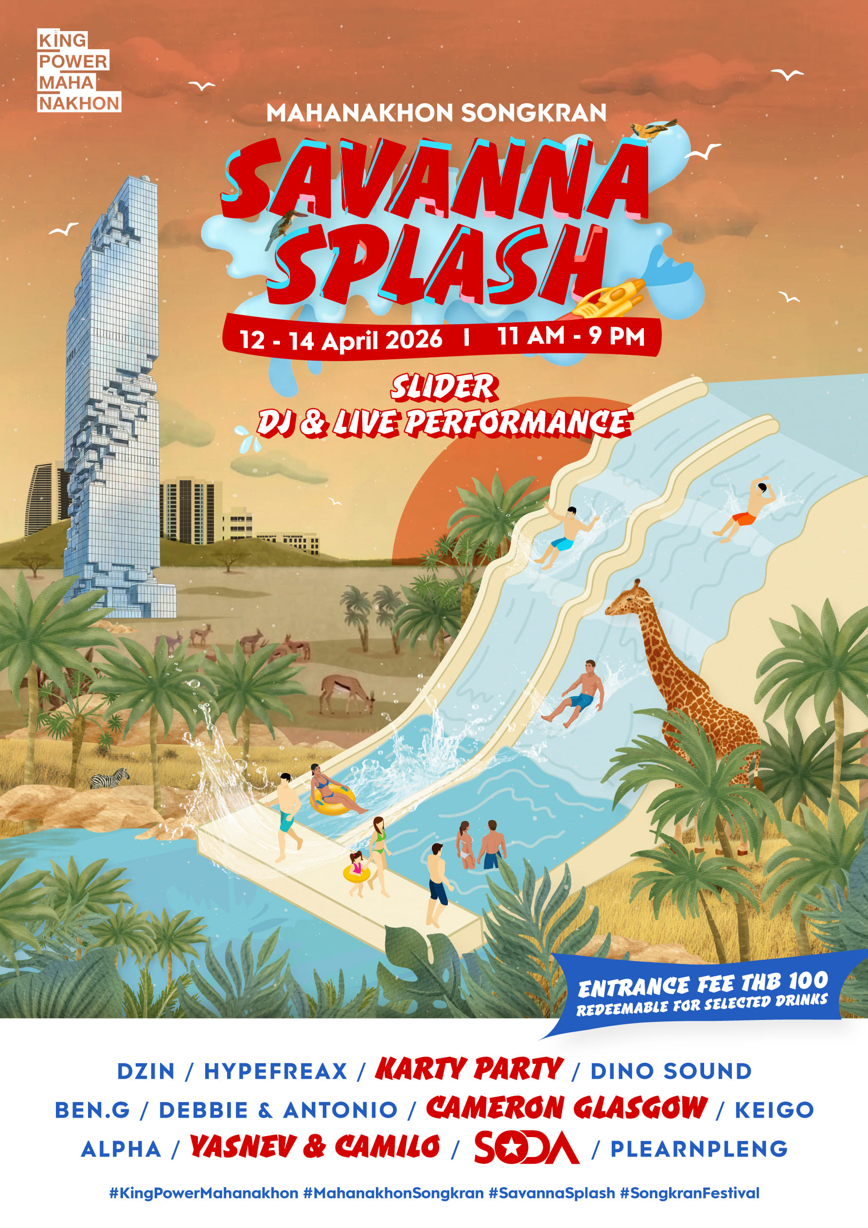 คิง เพาเวอร์ มหานคร แลนด์มาร์คสถาปัตยกรรมระดับโลกใจกลาง กรุงเทพมหานคร ประกาศจัดงาน “Mahanakhon Songkran Savanna Splash 2026” ระหว่างวันอาทิตย์ที่ 12 - วันอังคารที่ 14 เมษายน 2569 ตั้งแต่เวลา 11.00 - 21.00 น. มุ่งสร้างประสบการณ์สงกรานต์ ที่แตกต่างและมีเอกลักษณ์ไม่เหมือนใคร เพื่อตอบโจทย์ไลฟ์สไตล์คนเมืองและนักท่องเที่ยวจากทั่วโลก