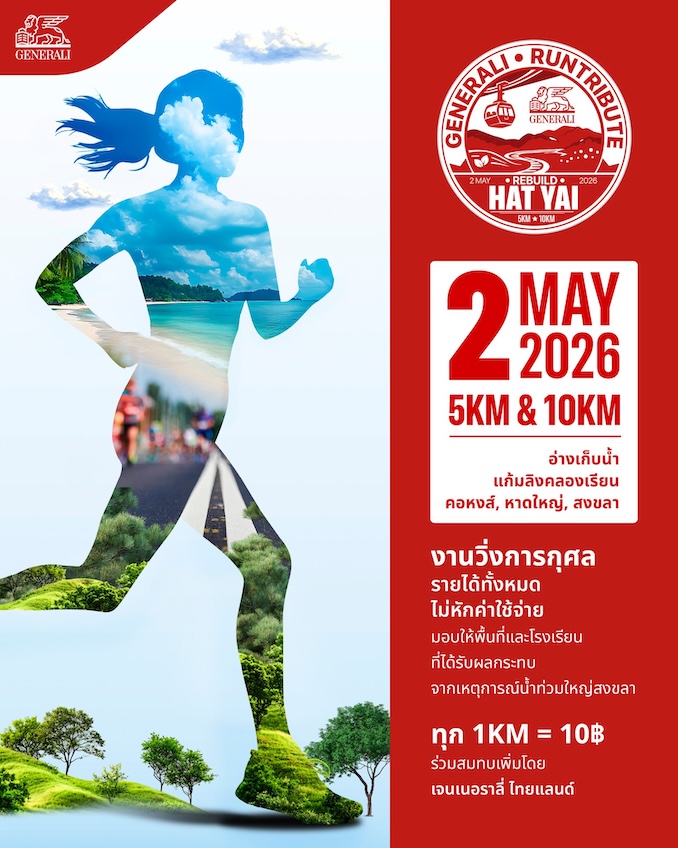เจนเนอราลี่ ไทยแลนด์ ขอเชิญชวนประชาชนและผู้รักสุขภาพ ร่วมเป็นส่วนหนึ่งของพลังแห่งการให้ในกิจกรรม “GENERALI RUNTRIBUTE: REBUILD HAT YAI” งานวิ่งการกุศลที่จัดขึ้นเพื่อรวมพลังของนักวิ่งและคนไทยทุกคน สร้างพลังเล็กๆ ที่ยิ่งใหญ่ เพราะทุกก้าวของคุณคือความห่วงใย และทุกการเข้าเส้นชัย คือพลังฟื้นฟูชุมชนและส่งต่อความห่วงใยไปยังพื้นที่ที่ได้รับผลกระทบจากเหตุการณ์น้ำท่วมใหญ่ จังหวัดสงขลา