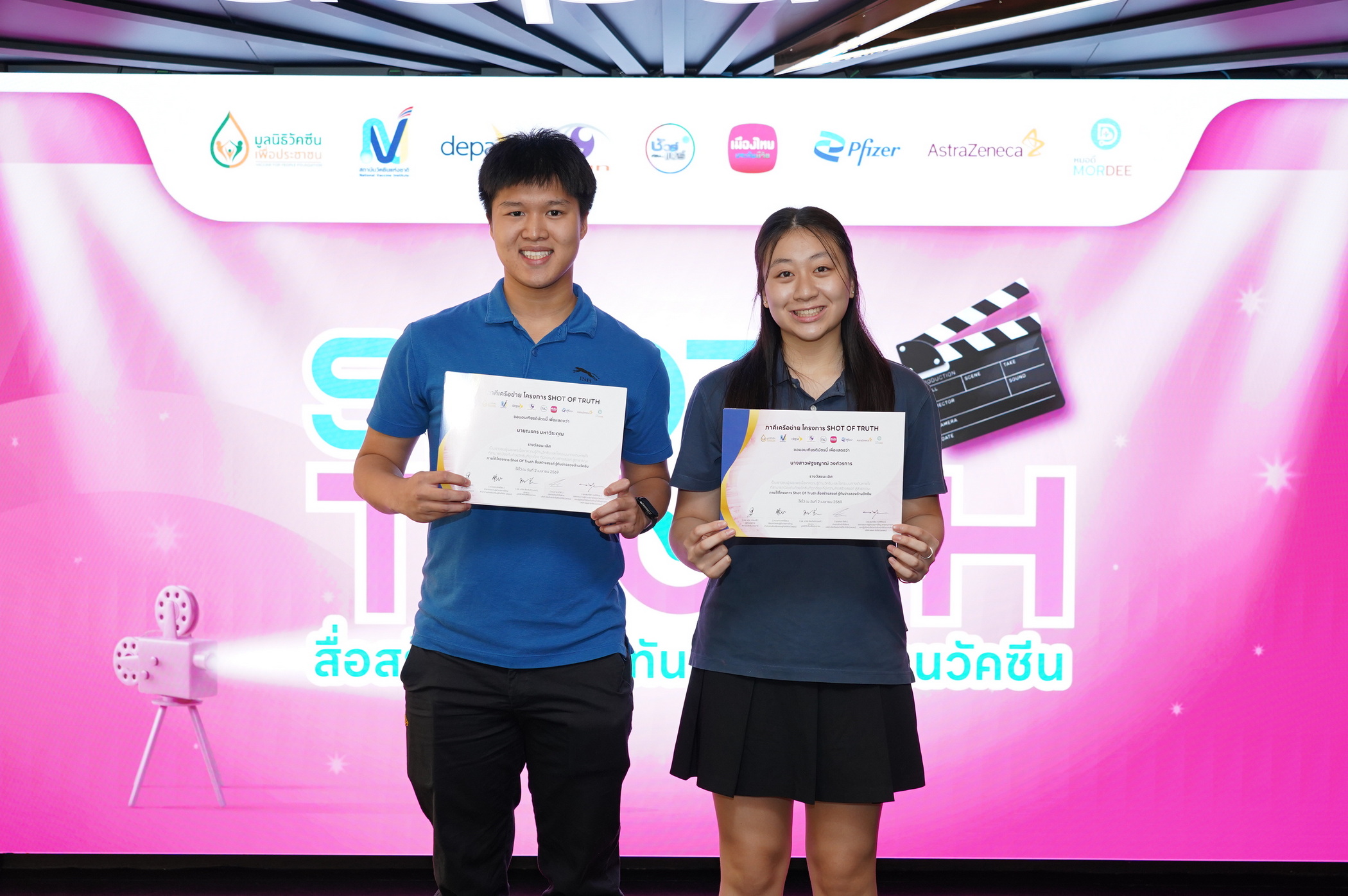 นายณธกร มหาวีระคุณ และนางสาวพัฐชญาณ์ วงศ์วรการ ตัวแทนทีม NERVE จากโรงเรียนสถานศึกษานานาชาติ ISB (International School Bangkok) คว้ารางวัลชนะเลิศและรางวัล Popular Vote กล่าวว่า “พวกเราตั้งใจทำให้เรื่องวัคซีนเข้าใจง่ายและใกล้ตัวมากขึ้นในยุคที่ข้อมูลมีทั้งจริงและเท็จปะปนกัน โครงการนี้ทำให้เราได้เรียนรู้การตรวจสอบข้อมูล และใช้ AI ช่วยรวบรวมก่อนนำมาสื่อสารผ่านคลิปวิดีโอ ซึ่งทำให้เห็นว่าคนรุ่นใหม่สามารถสร้างผลกระทบเชิงบวกต่อสังคมได้ และตั้งใจจะต่อยอดผลงานเพื่อเผยแพร่ความรู้ต่อไป”