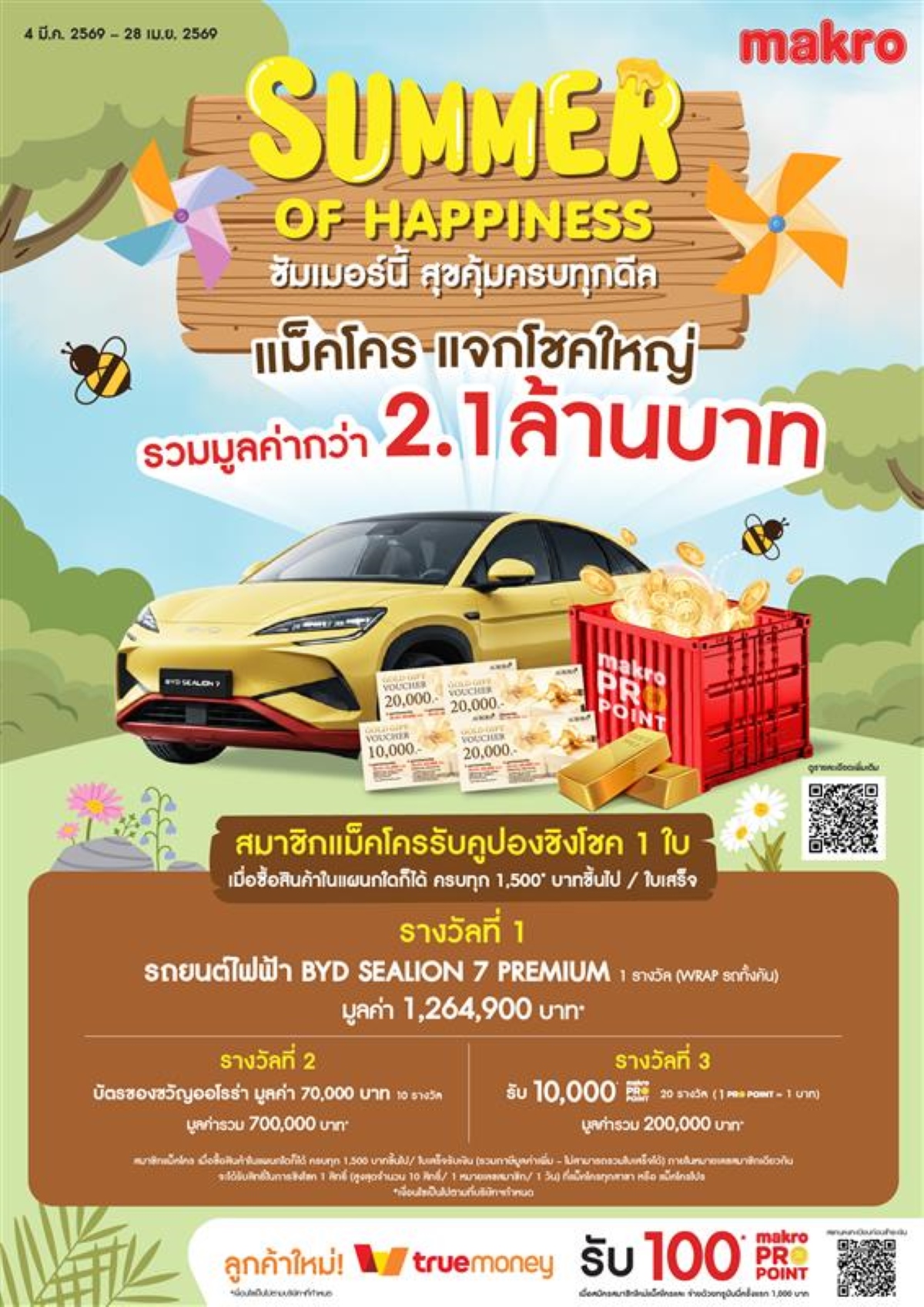 “แม็คโคร Summer of Happiness ซัมเมอร์นี้ สุขคุ้มครบทุกดีล” ต้อนรับซัมเมอร์และเทศกาลสงกรานต์ เปิดแคมเปญ ชวนลูกค้าช้อปสุดคุ้ม พร้อมลุ้นกับกิจกรรม “แม็คโคร แจกโชคใหญ่” ชิงรางวัลใหญ่ รถยนต์ไฟฟ้า BYD รุ่น SEALION 7 PREMIUM และของรางวัลอื่นๆ รวมมูลค่ากว่า 2.1 ล้านบาท สำหรับสมาชิกแม็คโคร เพียงซื้อสินค้าที่ร่วมรายการ ครบทุก 1,500 บาทต่อใบเสร็จ รับคูปองชิงโชค 1 สิทธิ์ ระหว่างวันที่ 4 มีนาคม – 28 เมษายน 2569 ที่ แม็คโคร ทุกสาขาทั่วประเทศ และผ่านช่องทางออนไลน์ รวมถึงแอปพลิเคชัน Makro PRO ตลอดช่วงแคมเปญ (ภายใต้เงื่อนไขที่บริษัทกำหนด) พบทัพสินค้าคลายร้อนต้อนรับซัมเมอร์และสงกรานต์ในราคาพิเศษ อาทิ พัดลมคุณภาพ ,เครื่องปรับอากาศจากหลากหลายแบรนด์ชั้นนำ, ปืนฉีดน้ำนำเข้าจากแบรนด์ชั้นนำ เช่น เนิร์ฟ (NERF) ,สระว่ายน้ำเป่าลม (Intex) และอุปกรณ์เล่นน้ำอีกหลากหลายรูปแบบ รวมถึง สินค้าลิขสิทธิ์คาแรคเตอร์หมีพูห์ ที่ช่วยเพิ่มสีสันและสร้างบรรยากาศแห่งความสุขให้กับทุกครอบครัวในช่วงเทศกาล