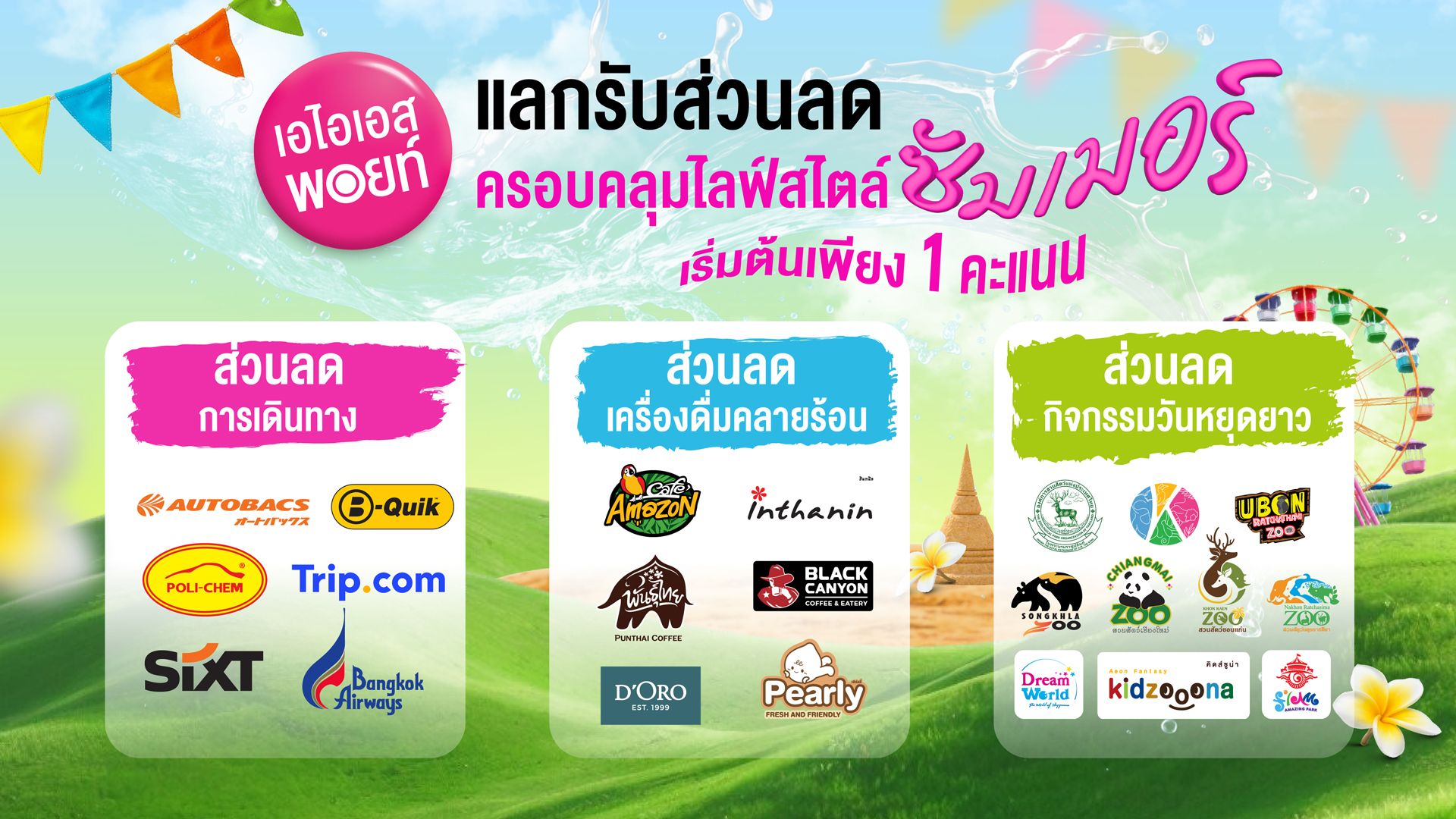 โดย นายประพัฒน์ เสียงจันทร์ หัวหน้าคณะผู้บริหารด้านธุรกิจค้าปลีก เอไอเอส และ นายเลิศชัย กดทรัพย์ หัวหน้าคณะผู้บริหารด้านธุรกิจโมบาย เอไอเอส ดูแลลูกค้าตั้งแต่ก่อนออกเดินทาง ระหว่างเดินทาง ไปจนถึงช่วงพักผ่อนในวันหยุดยาวอย่างครบวงจร ด้วยไฮไลต์แคมเปญสุดว้าว “12 Weeks 12 WOW!” ภายใต้แนวคิด “อุ่นใจทุกเส้นทาง” ที่ให้ลูกค้าใช้ AIS Point เพียง 1 คะแนน แลกรับสิทธิประโยชน์ต่างๆ ผ่านแอป myAIS ดังนี้