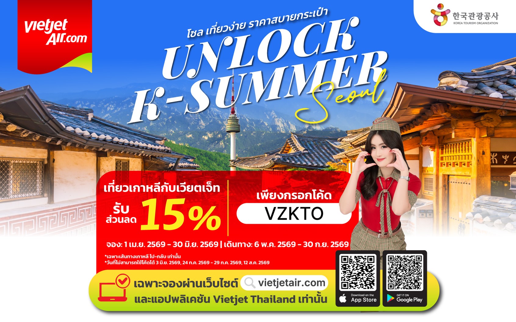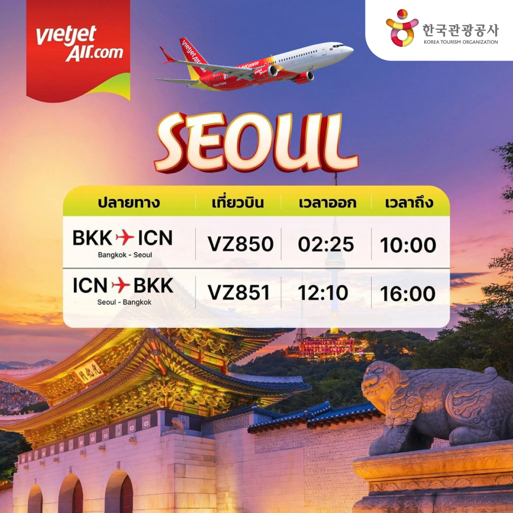 เวียตเจ็ทไทยแลนด์ ร่วมกับองค์การส่งเสริมการท่องเที่ยวเกาหลี (Korea Tourism Organization หรือ KTO) เปิดตัวแคมเปญ “Unlock K-Summer Seoul with Vietjet Thailand x KTO” มอบส่วนลด 15% สำหรับเที่ยวบินไป-กลับ ระหว่างกรุงเทพฯ และกรุงโซล ประเทศเกาหลีใต้ เมื่อทำการจองบัตรโดยสารและกรอกรหัส “VZKTO” ผ่านเว็บไซต์หรือแอปพลิเคชันของเวียตเจ็ทไทยแลนด์ ตั้งแต่วันนี้ – 30 มิถุนายน 2569 เพื่อกระตุ้นการเดินทางท่องเที่ยวของนักท่องเที่ยวไทยสู่ประเทศเกาหลีใต้ในช่วงฤดูร้อน พร้อมยกระดับการเชื่อมโยงระหว่างประเทศไทยและเกาหลีใต้ในทุกมิติ