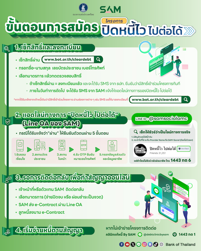 ทั้งนี้ ลูกหนี้สามารถตรวจสอบสิทธิ์เข้าร่วมโครงการได้ด้วยตนเอง แบบ “คลิกเดียวรู้ผลทันที” ผ่านช่องทางหลัก เว็บไซต์ ธนาคารแห่งประเทศไทย (ธปท.) www.bot.or.th/cleardebt และเว็บไซต์ บริษัท บริหารสินทรัพย์สุขุมวิท จำกัด www.sam.or.th เพียงกรอกข้อมูลส่วนตัว อาทิ ชื่อ-นามสกุล หมายเลขบัตรประชาชน หมายเลขโทรศัพท์ให้ครบถ้วน และหากลูกหนี้มีคุณสมบัติครบถ้วนตามเงื่อนไขทีกำหนด ระบบจะลงทะเบียนการเข้าร่วมโครงการให้โดยอัตโนมัติทันที! จากนั้นลูกหนี้จะได้รับการติดต่อผ่านทาง SMS จากธนาคารแห่งประเทศไทย และ SAM เพื่อยืนยันว่ามีคุณสมบัติตรงตามเงื่อนไขและสามารถเข้าร่วมโครงการได้
