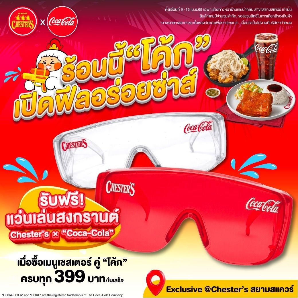 บริษัท เชสเตอร์ ฟู้ด จำกัด จับมือ บริษัท ไทยน้ำทิพย์ คอร์ปอเรชั่น จำกัด (มหาชน) จัดแคมเปญรับซัมเมอร์ “Chester’s x Coca-Cola” มอบประสบการณ์ความอร่อยฟีลซ่า พร้อมแจก “แว่นเล่นสงกรานต์” รุ่นลิมิเต็ดเอดิชัน สำหรับลูกค้าที่ซื้อเมนูเชสเตอร์คู่โค้กครบ 399 บาทต่อใบเสร็จ รับฟรีทันที 1 ชิ้น โดยแว่นดีไซน์พิเศษกันน้ำ ใส่เล่นสงกรานต์ได้ตลอดวัน ทั้งนี้ แคมเปญจัดขึ้นระหว่างวันที่ 9–15 เมษายน 2569 เฉพาะร้านเชสเตอร์ สาขาสยามสแควร์เท่านั้น หรือจนกว่าสินค้าจะหมด