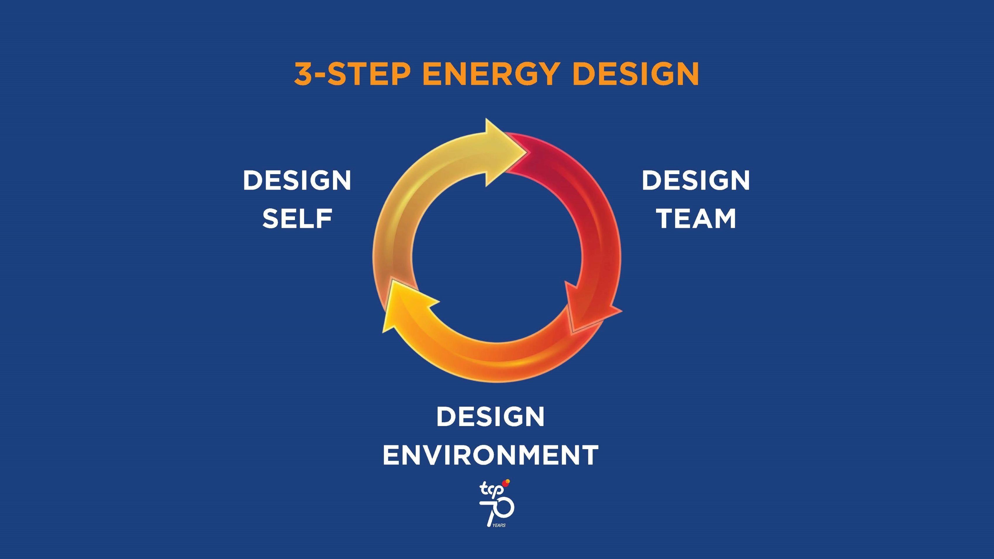 กลุ่มธุรกิจ TCP ใช้ประสบการณ์อันยาวนานกว่า 70 ปี ถอดบทเรียนเรื่อง “พลัง” ออกมาเป็นแนวคิด 3 Step Energy Design เพื่อใช้กับการออกแบบพลังการทำงานในองค์กรอย่างเป็นรูปธรรม เริ่มจาก Design Self หรือการออกแบบพลังในระดับบุคคล โดยทำให้คนมองเห็น Meaningful Job หรือความหมายของงานที่ตัวเองทำ เช่น พนักงานฝ่ายผลิตไม่ได้เป็นเพียงคนคุมเครื่องจักร แต่คือคนที่กำลังส่งมอบสินค้าที่มีคุณภาพให้กับผู้คนจำนวนมาก เมื่อเห็นตัวเองอยู่ในภาพความสำเร็จนั้น เขาจะไม่ได้ทำงานด้วยหน้าที่เพียงอย่างเดียว แต่ทำด้วยใจที่อยากไปต่อ