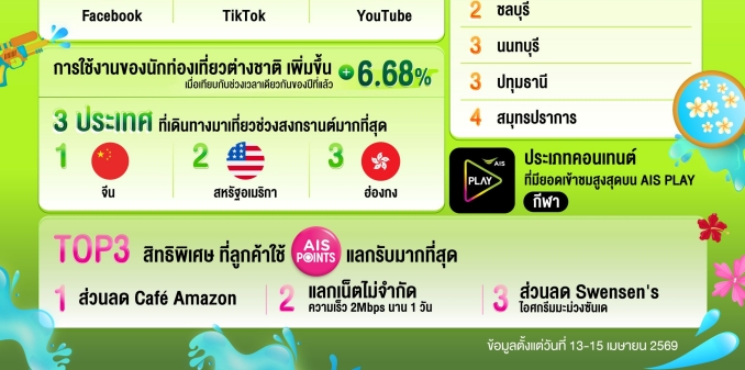 - อัตราการเติบโตของการแลกสิทธิเศษในช่วงสงกรานต์ ตั้งแต่วันที่ 11-15 เมษายน 2569 เพิ่มขึ้น 15% โดย Top 3 อันดับ สิทธิพิเศษที่ลูกค้าใช้คะแนน AIS Points แลกมากที่สุด อันดับ 1 คือ แลกรับส่วนลด Café Amazon, แลกรับเน็ตไม่จำกัด ความเร็ว 2Mbps นาน 1 วัน และส่วนลด Swensen's ไอศกรีมมะม่วงซันเด