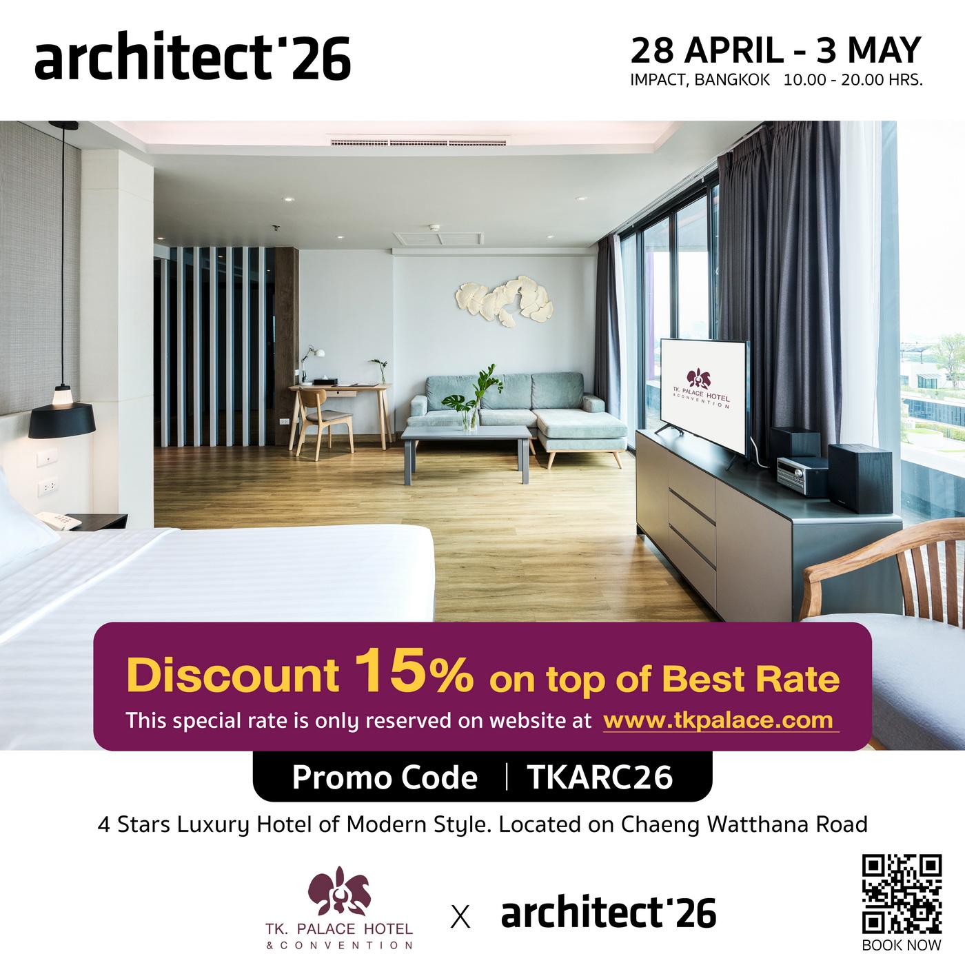 นอกจากนี้ TK Palace Hotel & Convention ยังมอบส่วนลดพิเศษ 15% จากราคาห้องพักที่ดีที่สุด สำหรับผู้เข้าร่วมงานสถาปนิก’69 เพียงจองผ่านเว็บไซต์ www.tkpalace.com และใช้รหัสโปรโมชั่น TKARC26 เพื่อ